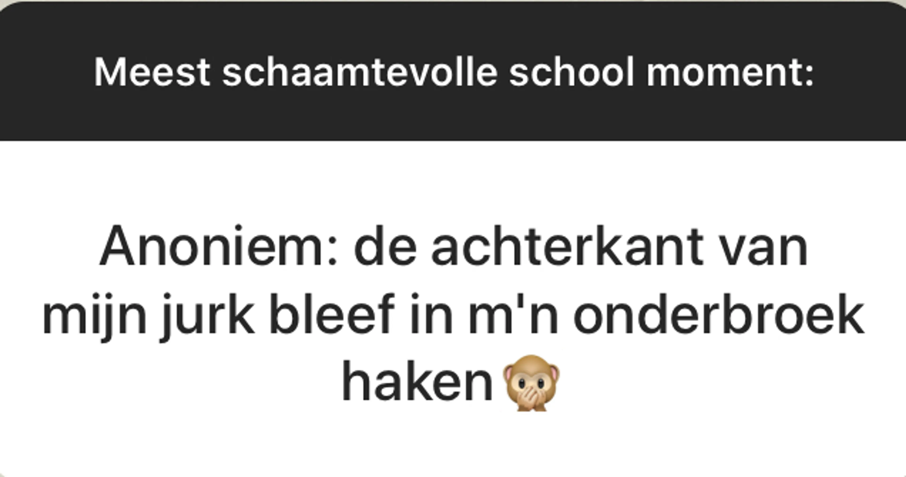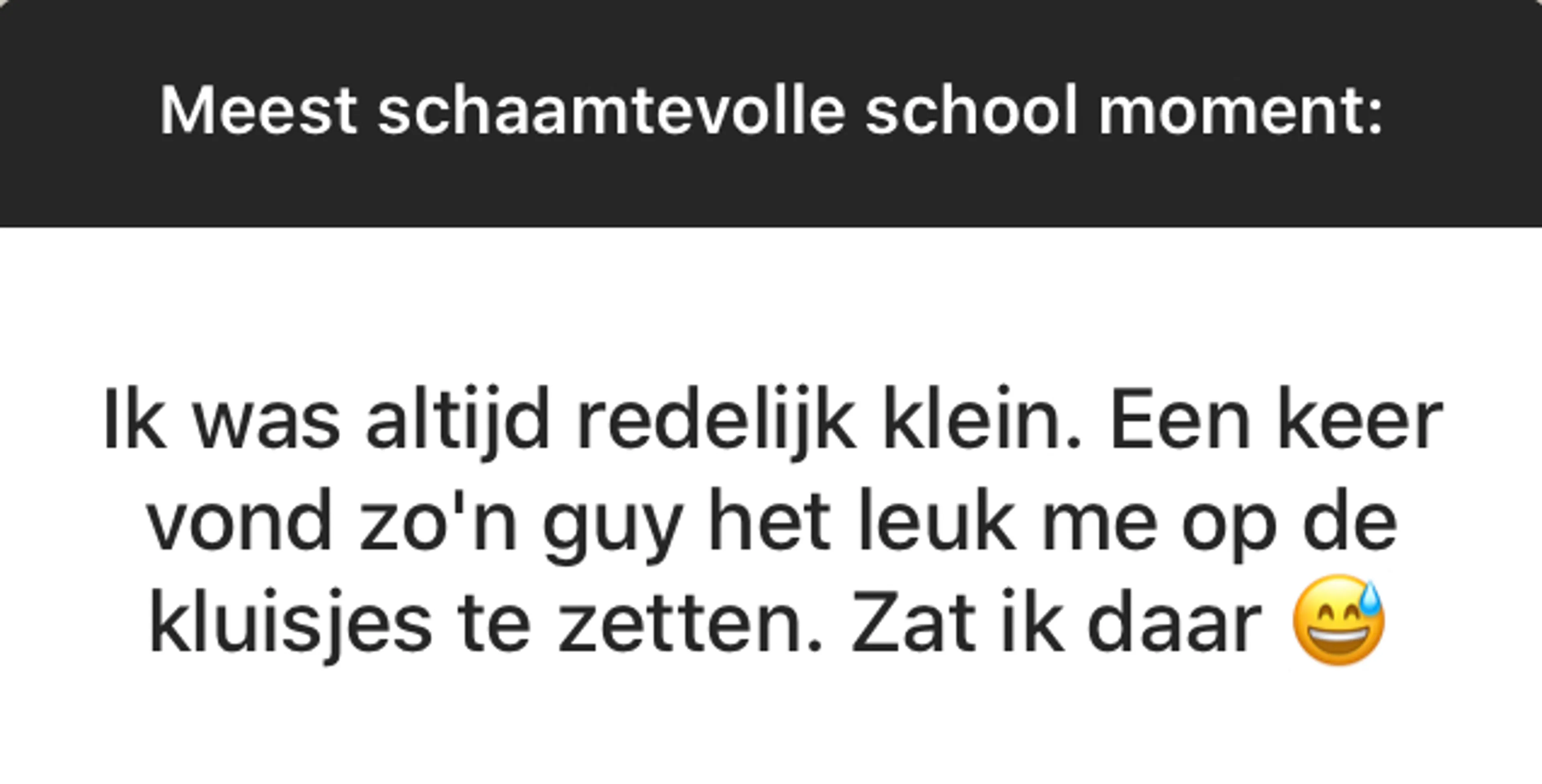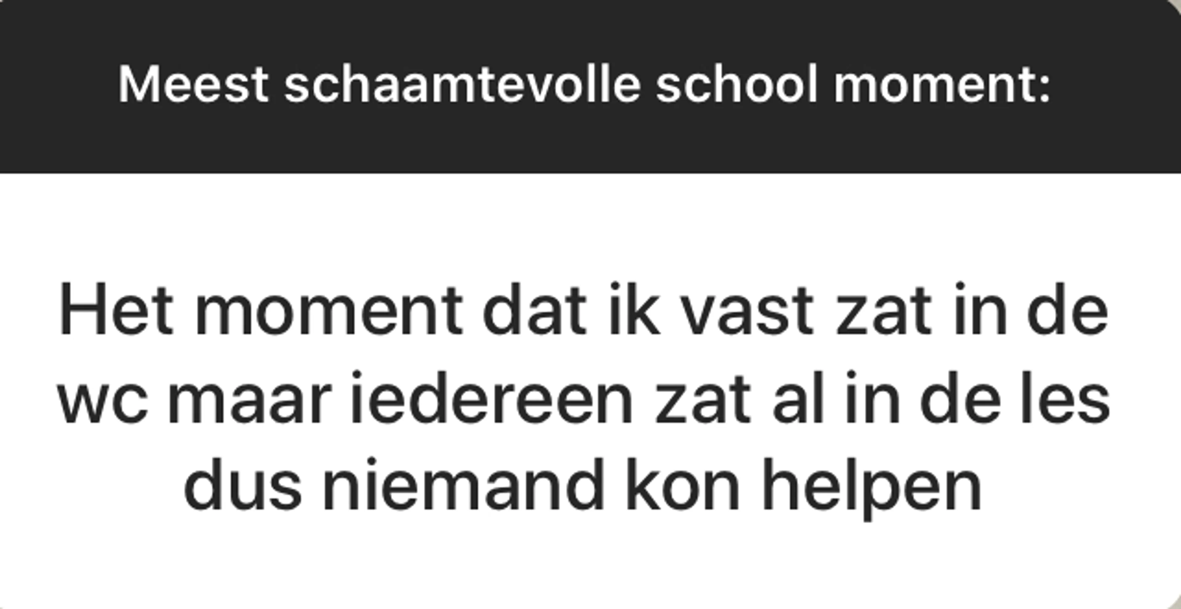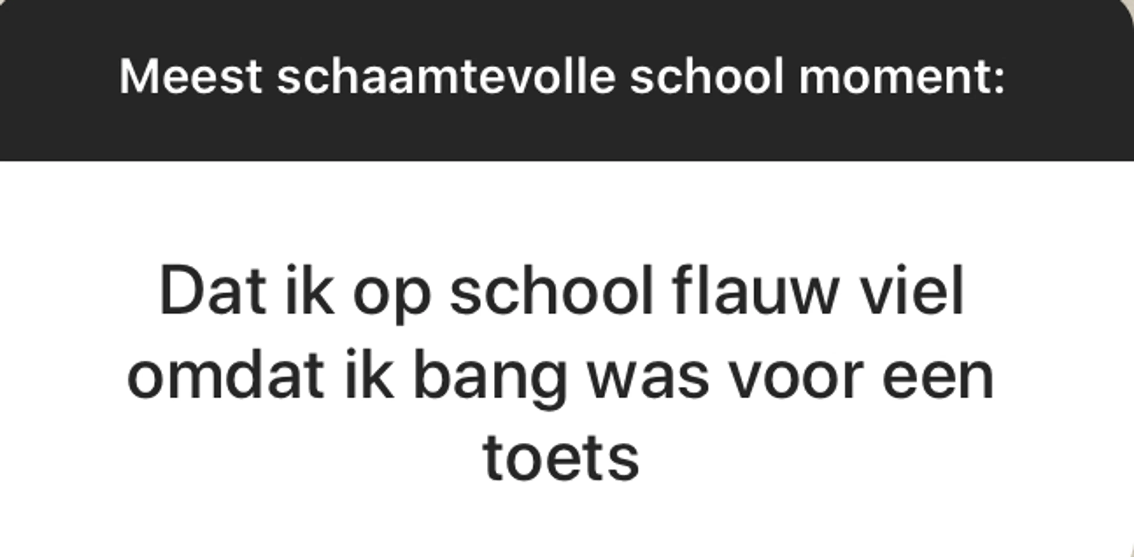 BEAM is een fantastische community met duizenden jongeren die allerlei geniale, moeilijke, mooie en soms niet normaal grappige dingen meemaken. Elke week stellen wij onze volgers via ons Instagram-account (@EOBEAM) een vraag en delen we de meest opvallende antwoorden met jou. Deze week: Wat is jouw meest schaamtevolle schoolervaring?