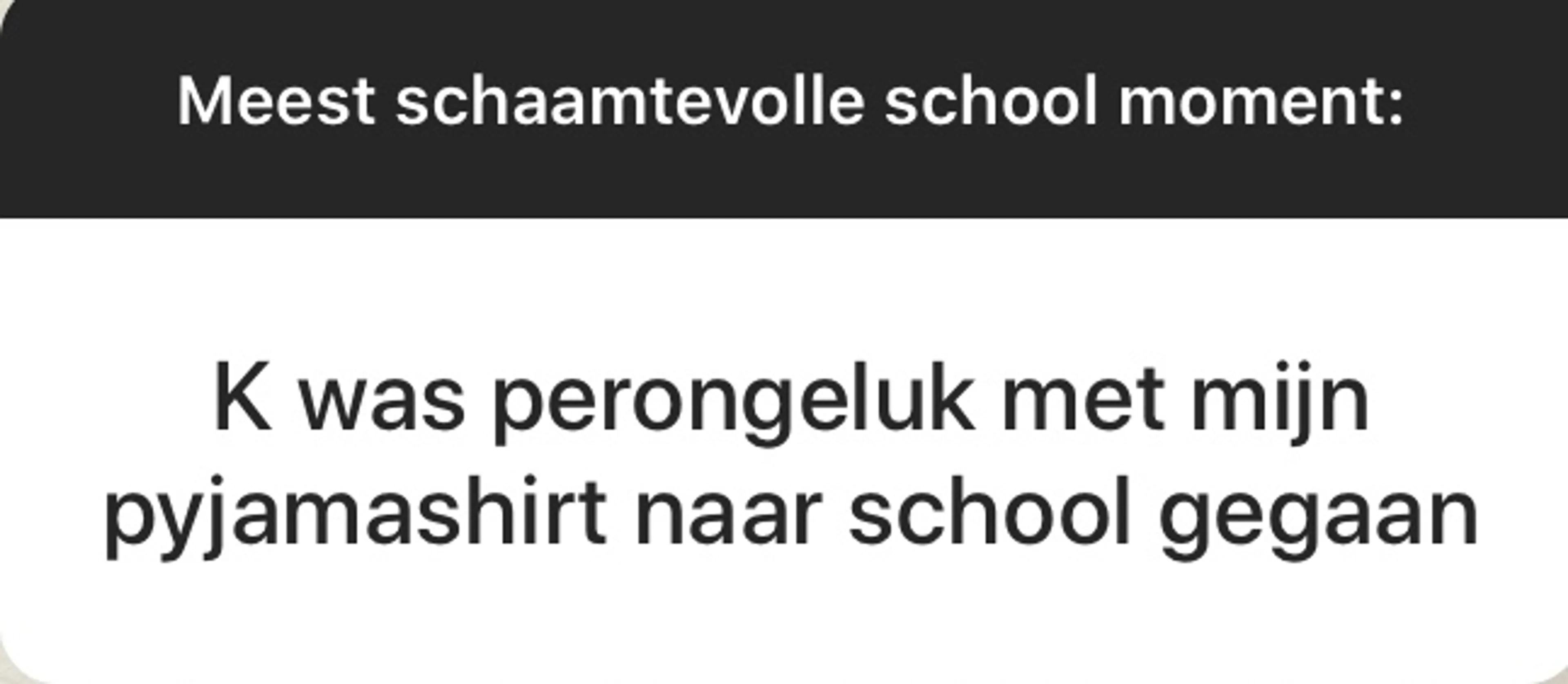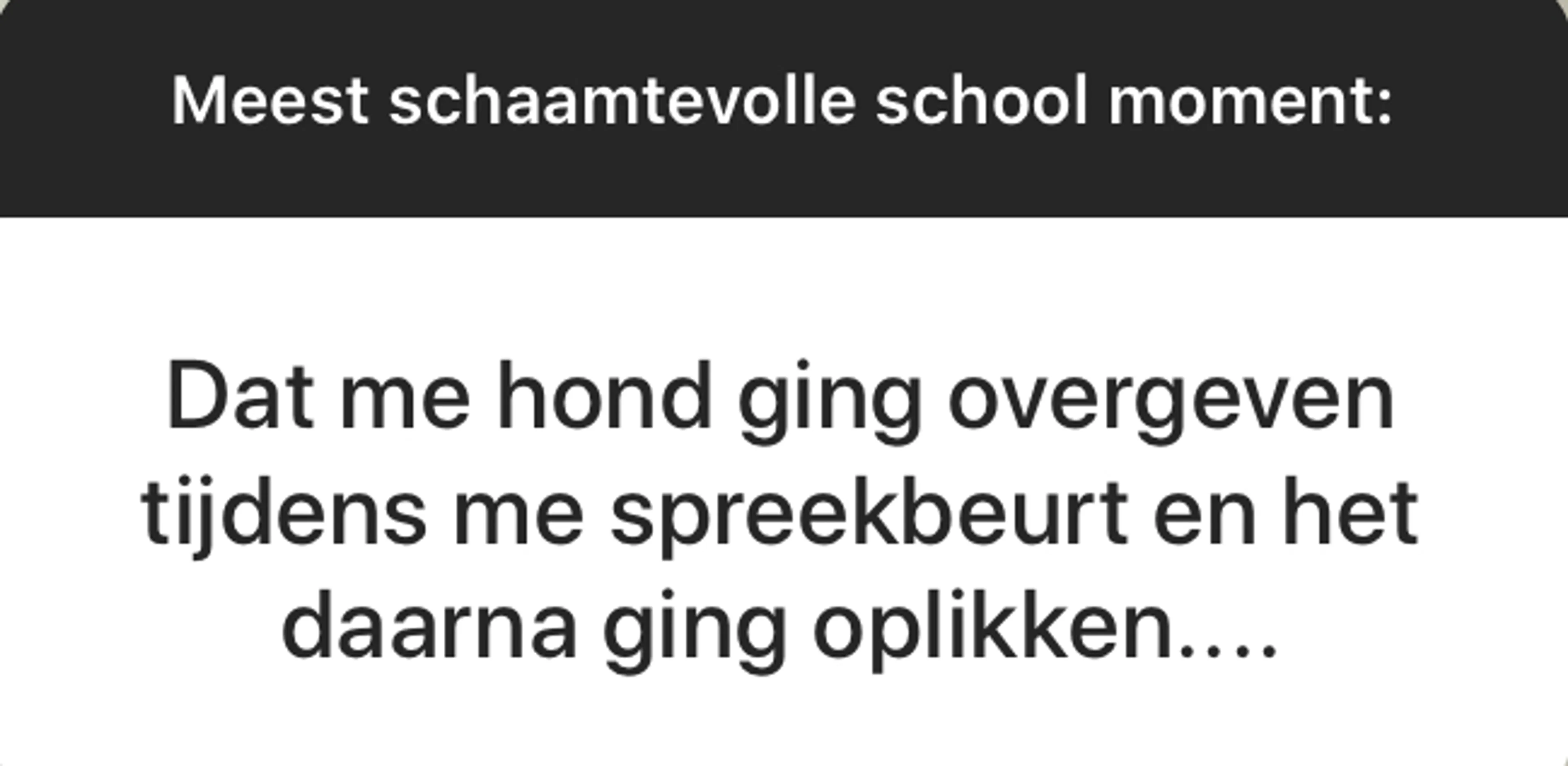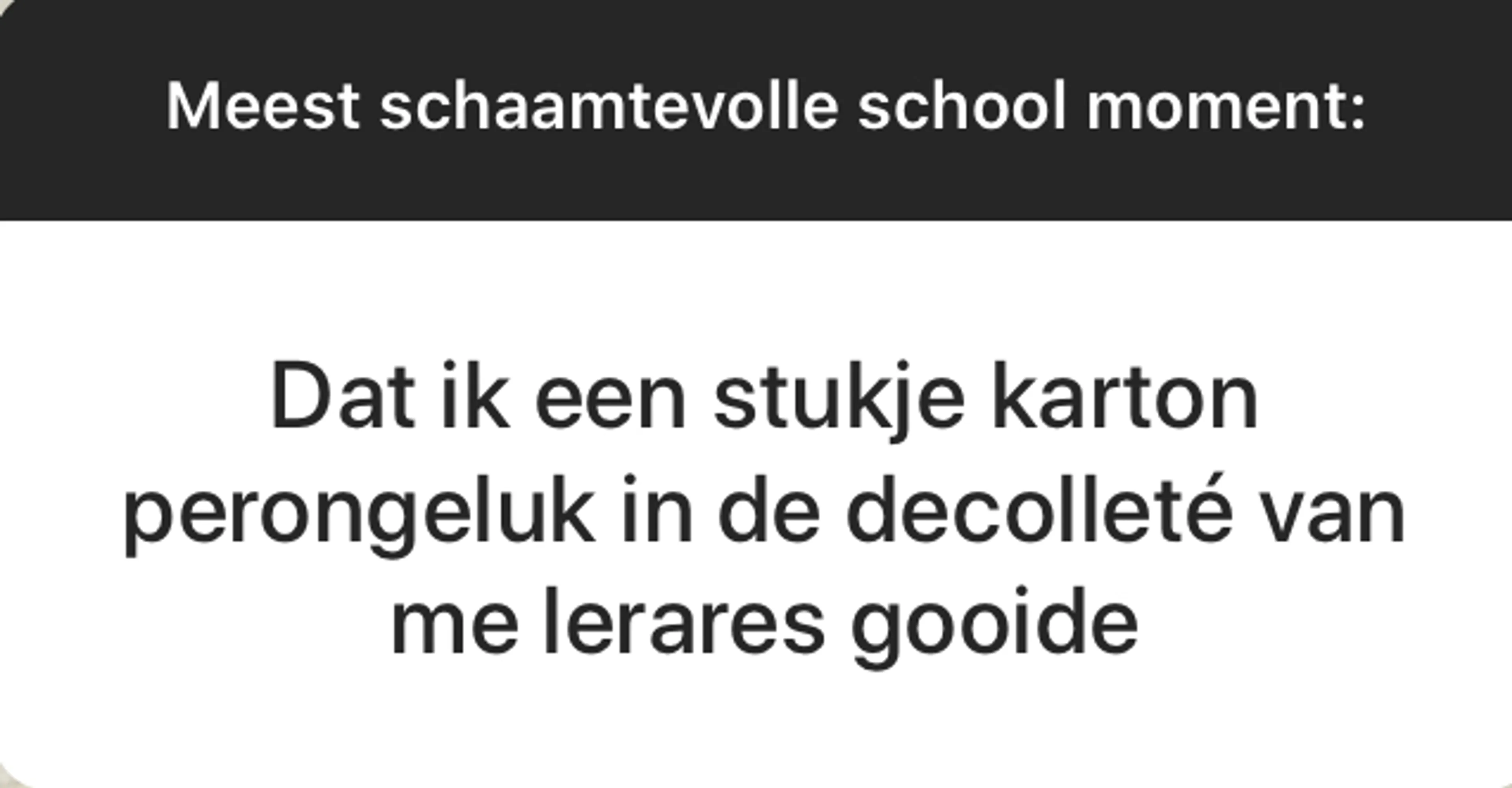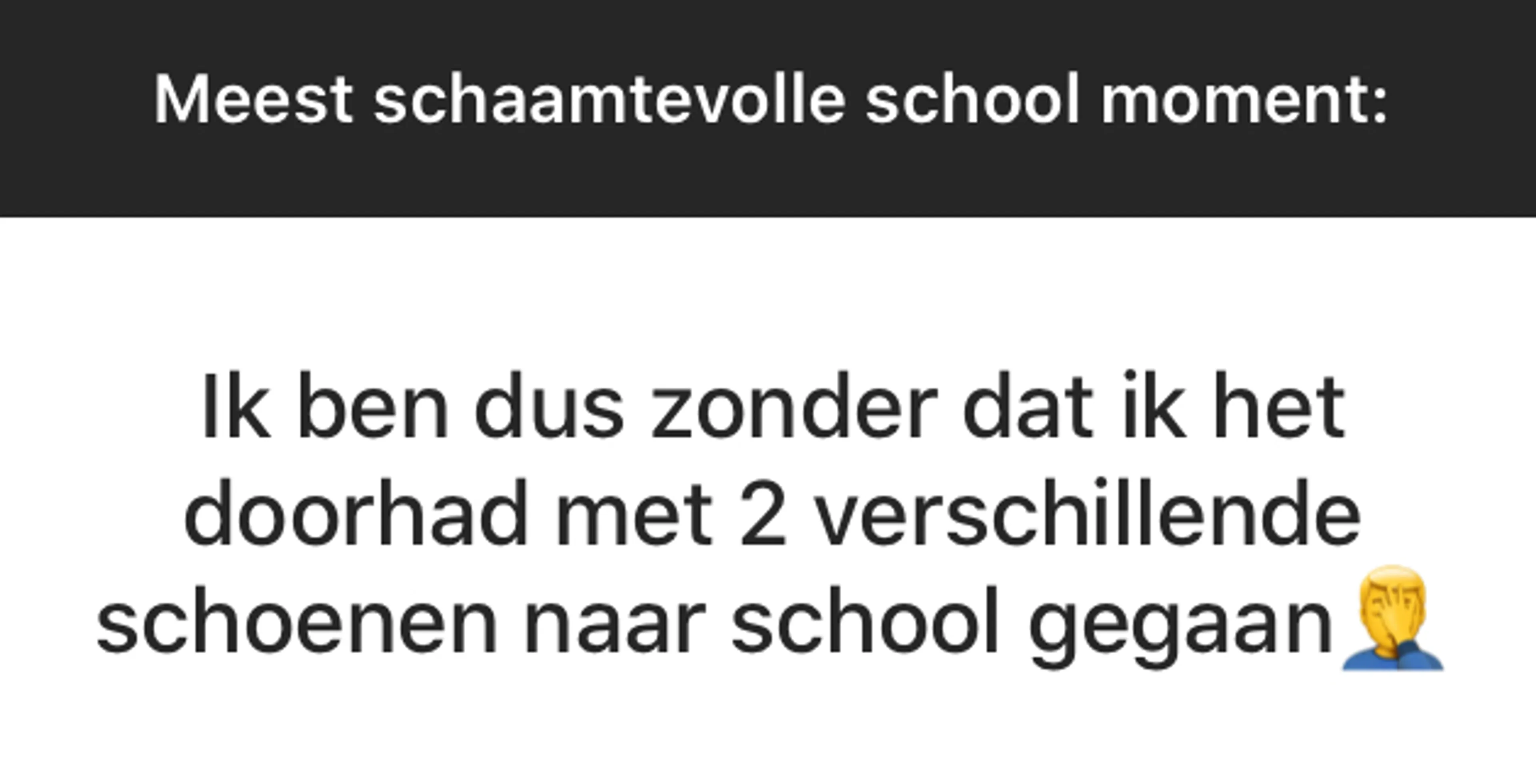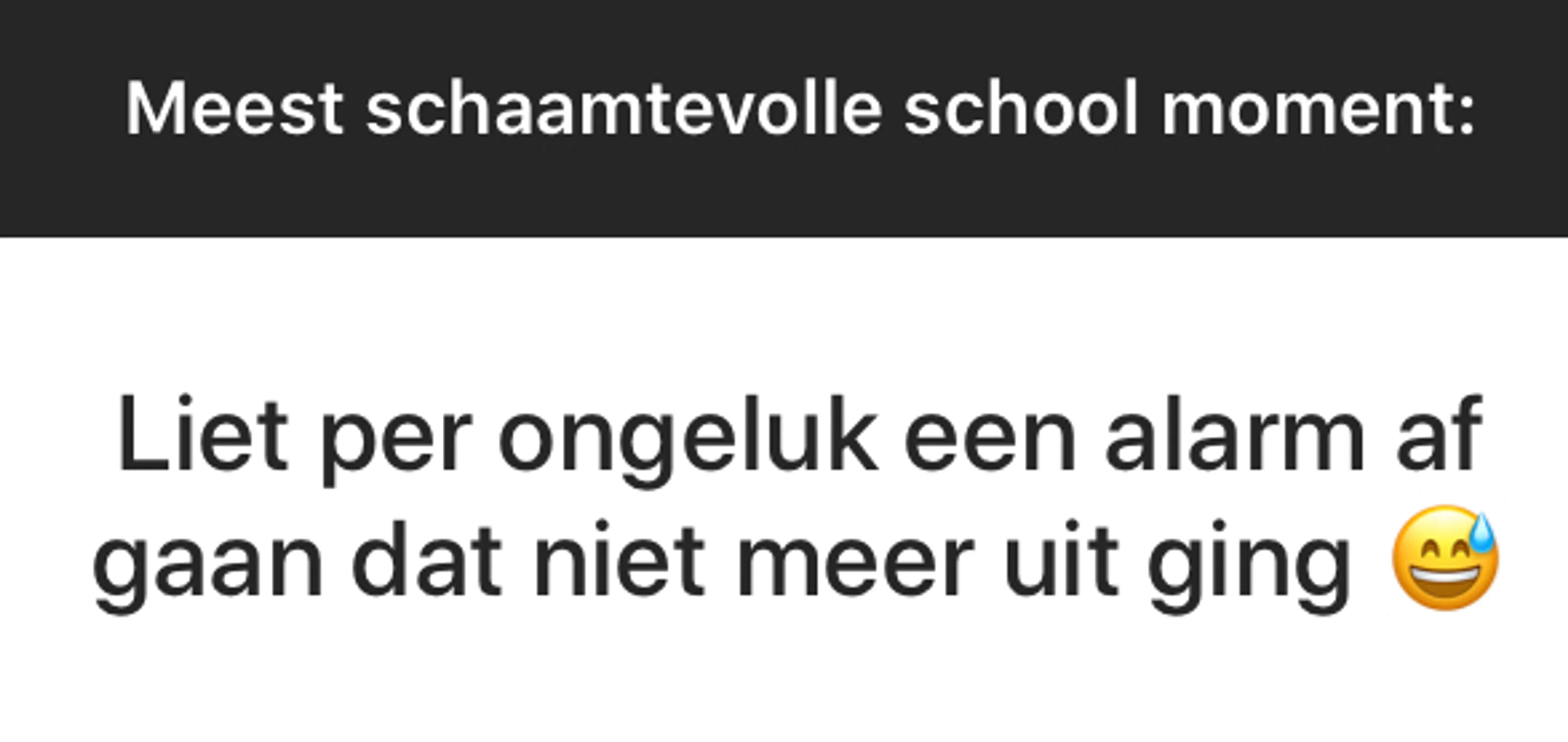 BEAM is een fantastische community met duizenden jongeren die allerlei geniale, moeilijke, mooie en soms niet normaal grappige dingen meemaken. Elke week stellen wij onze volgers via ons Instagram-account (@EOBEAM) een vraag en delen we de meest opvallende antwoorden met jou. Deze week: Wat is jouw meest schaamtevolle schoolervaring?