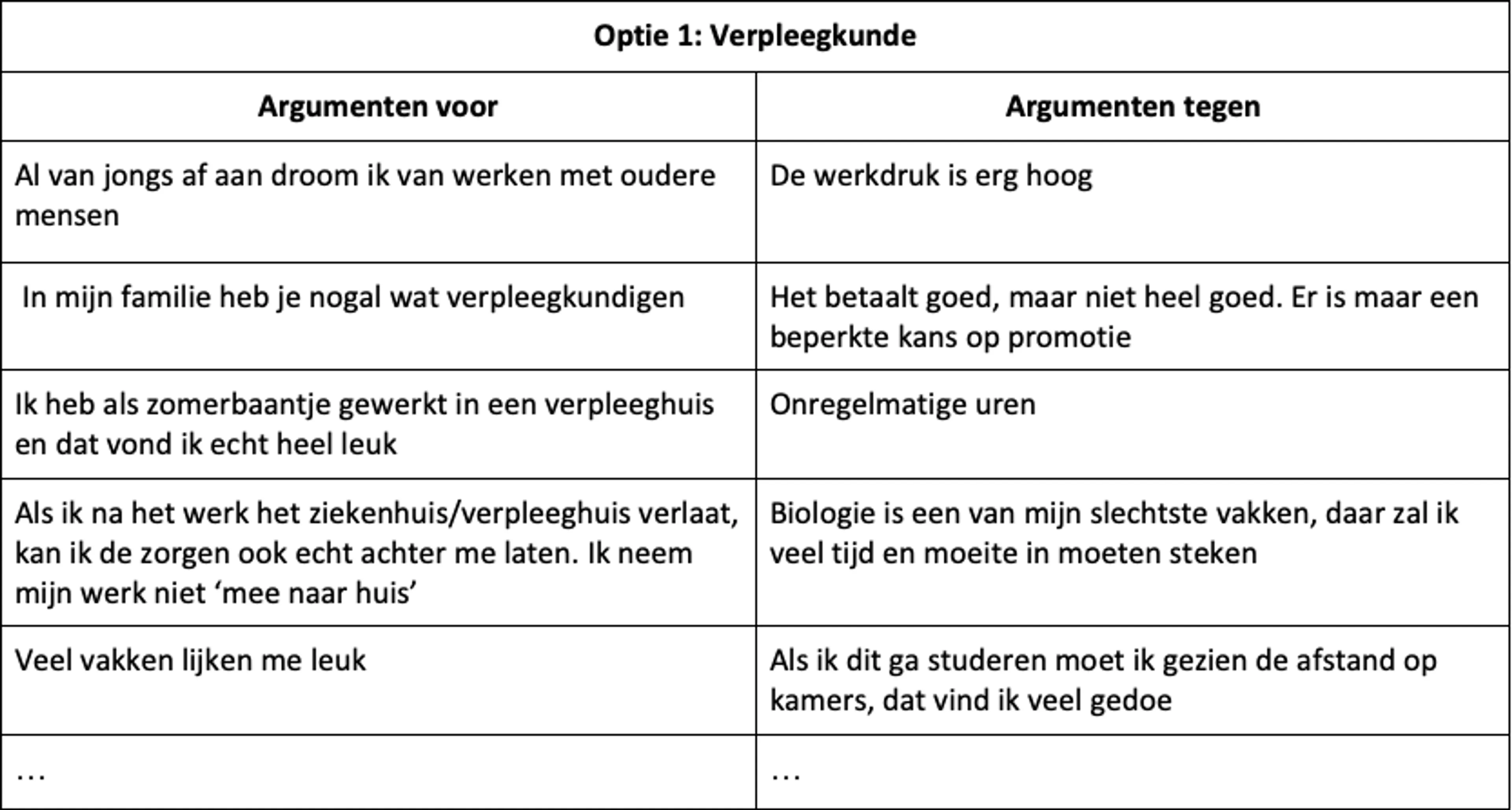 Als jij aan de slag gaat met een voor- en nadelen lijstje voor beide studies die je nog als opties hebt, helpt dit voorbeeldje misschien een beetje. Gebruik dit vooral ter inspiratie: