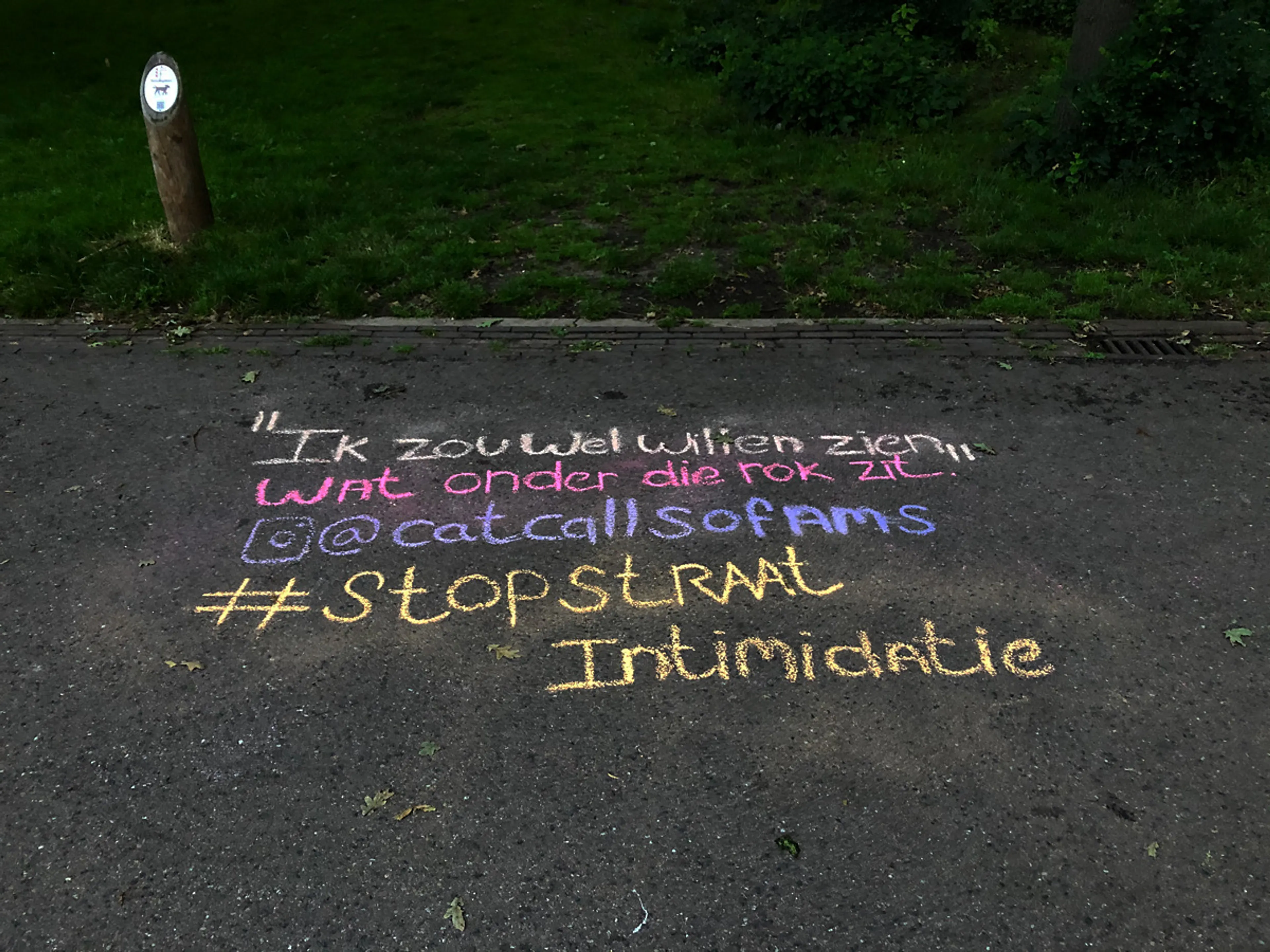 “De DM’s van Cat Calls Of Amsterdam zitten dagelijks vol met verhalen van mannen en vrouwen die gecatcalled of seksueel geïntimideerd zijn op straat. Deze verhalen schrijven mijn team en ik met stoepkrijt op de straten van Amsterdam, en van het krijtkunstwerk posten we een foto op Instagram. In 2017, toen was ik 15 jaar, postte ik mijn allereerste bericht op Cat Calls Of Amsterdam. De eerste twee jaar krijtte ik vooral ervaringen van mezelf, zussen of vriendinnen. Inmiddels is het account zó hard gegroeid dat ik ongeveer tien DM’s per dag krijg van volgers die een straatintimidatieverhaal hebben. Vaak gaat het over vervelende dingen die worden geroepen, maar soms zelfs over aanranding en verkrachting.