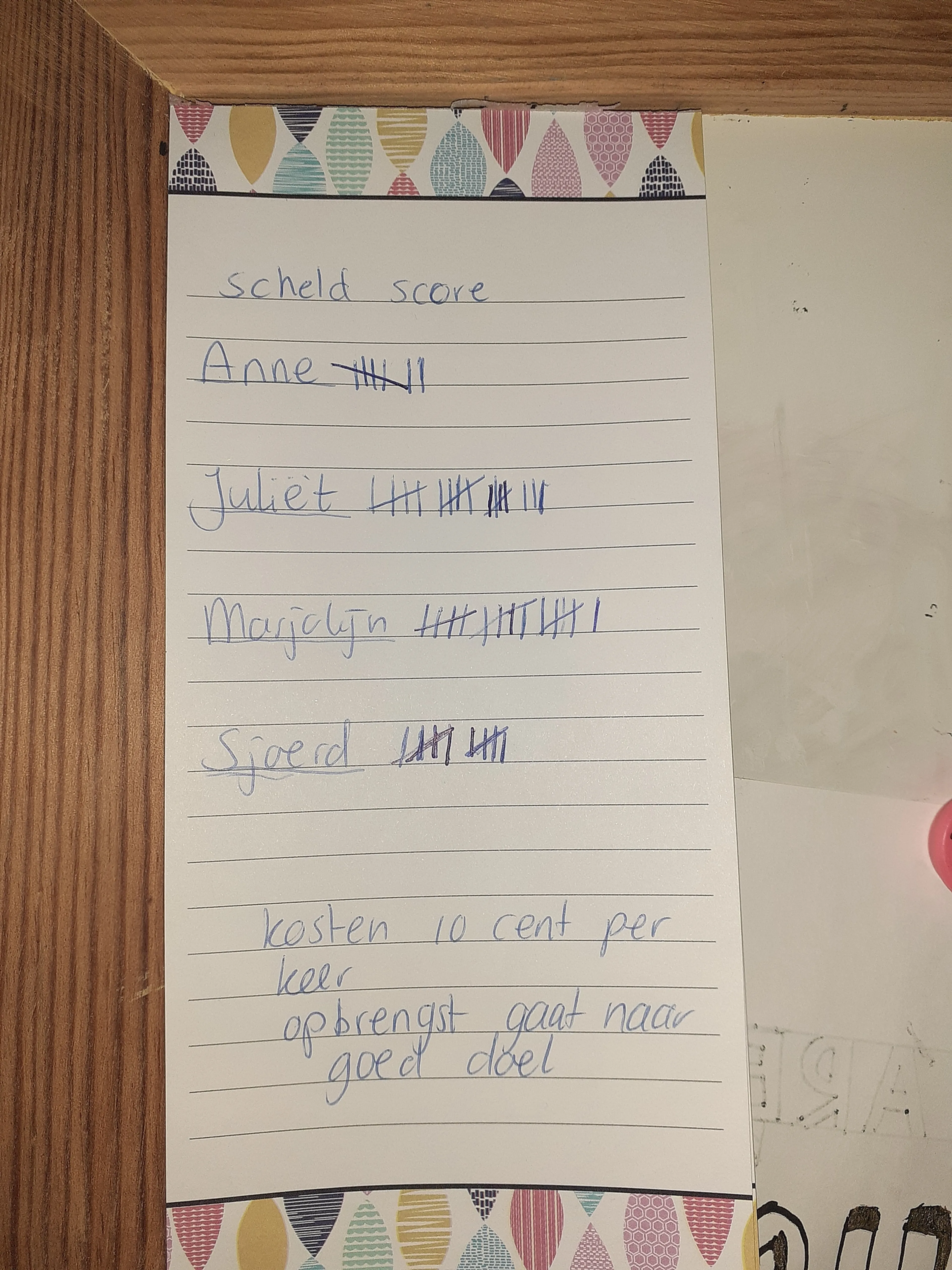 “Best wel goed! Elke keer als iemand scheldt in ons gezin komt er een streepje bij zijn of haar naam. Ik heb nu zeven streepjes, maar mijn zusje heeft er bijvoorbeeld al achttien. Het gaat dus nog redelijk goed! Ik vind het soms lastig, want je moet er geregeld rekening mee houden. We hebben met z’n allen afgesproken om tijdens een ruzie elkaar er niet op te wijzen. Dan wordt de ruzie alleen maar erger. Maar als ik bijvoorbeeld iets laat vallen en me even niet in kan houden, dan hoor ik mijn zusje alweer zeggen: “Streepje!”