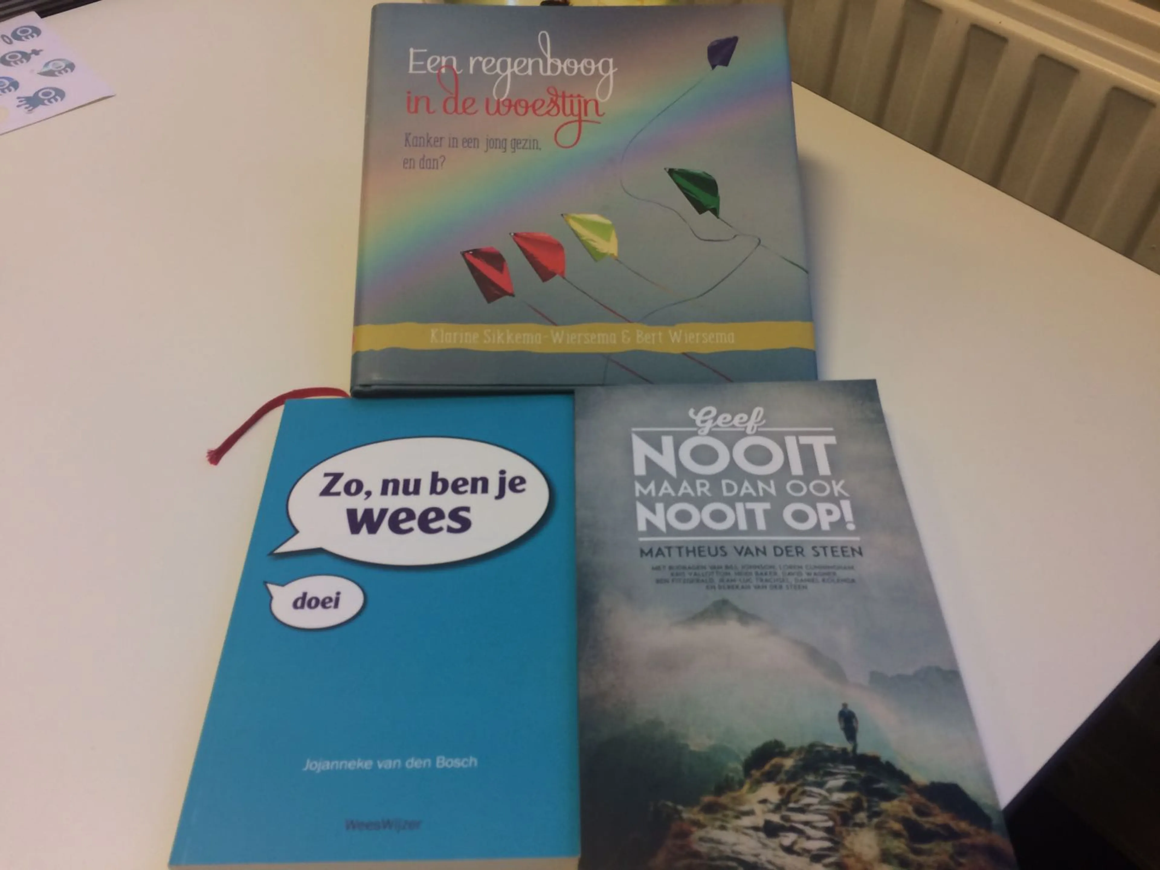 3 boeken die allemaal gaan over rouw en ziekte. 'Geef nooit maar dan ook nooit op' is een eerlijk boek over teleurstellingen en dieptepunten in het leven.