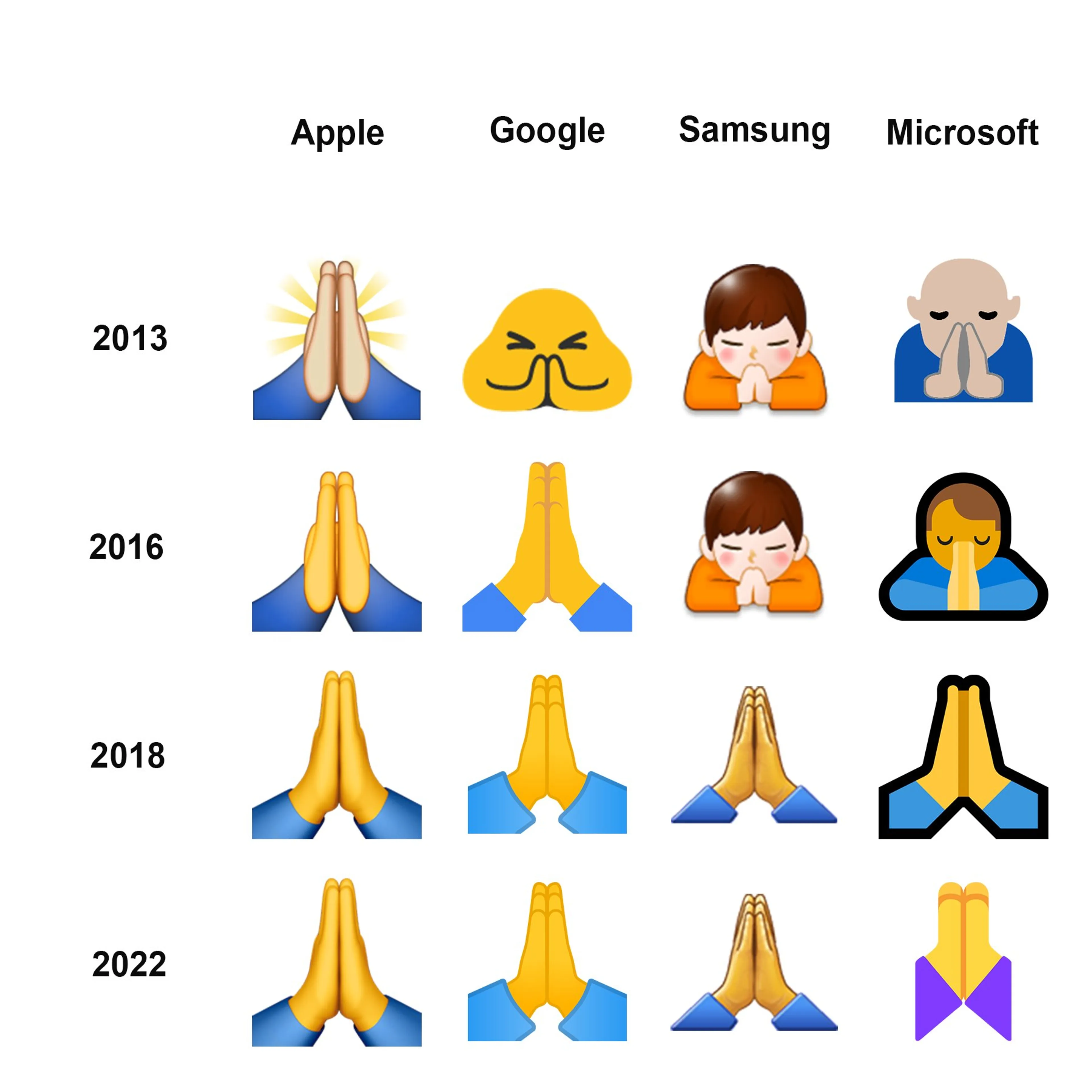 Er is een overduidelijke winnaar. De betekenis van 🙏 komt het meest in de buurt van bidden. Als je de geschiedenis van deze specifieke emoji onderzoekt, wordt er meer duidelijk. Emojipedia (de Wikipedia van de emoji’s) stelde dit schema samen; er is duidelijk te zien dat het in ieder geval géén high five is.