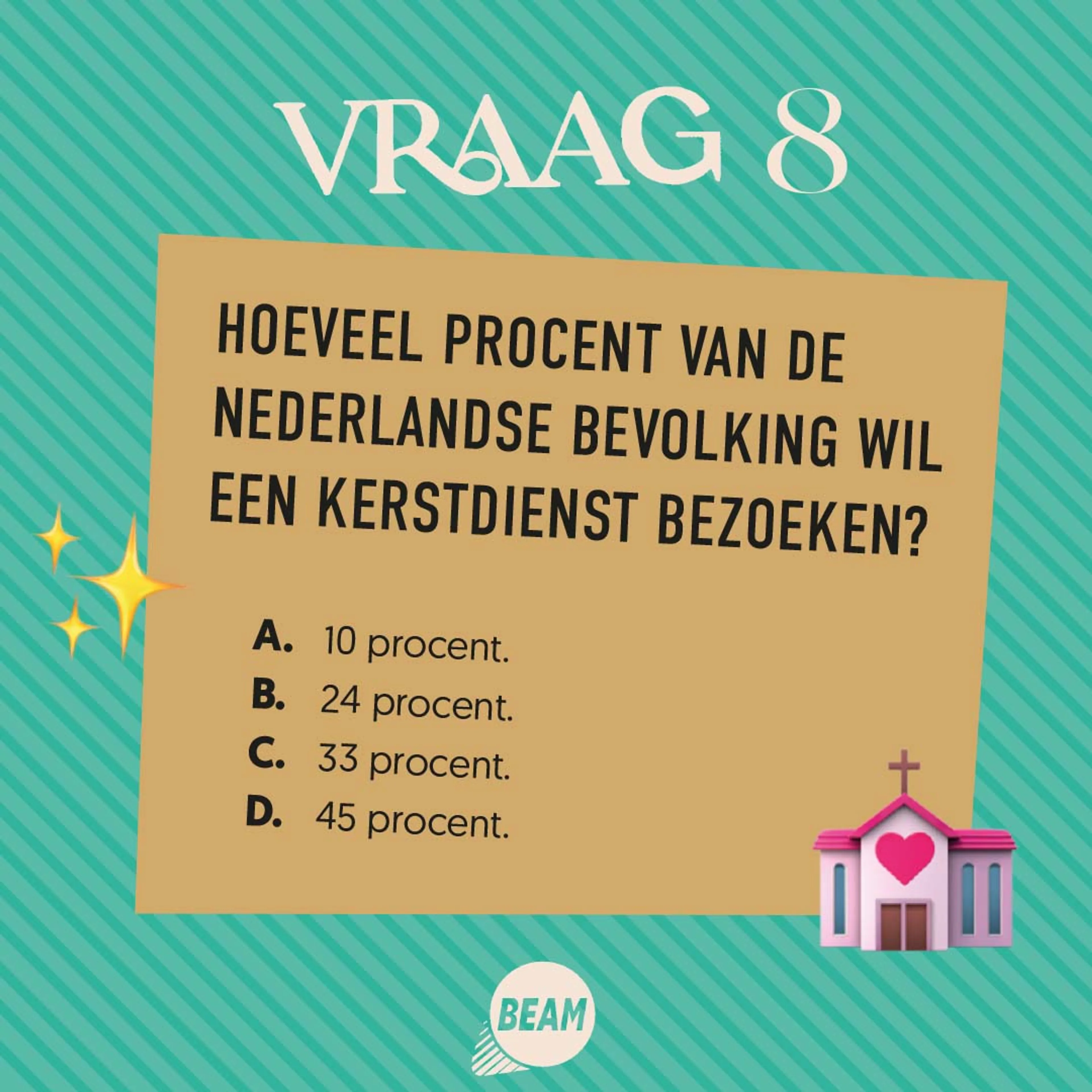 Een derde van de Nederlanders heeft in meer of mindere mate de intentie om tijdens Kerst een kerstdienst of -mis te bezoeken. Dat blijkt uit een onderzoek van de Protestantse Kerk in Nederland onder duizend Nederlanders van vijftien jaar en ouder. Dat betekent dat je 33 procent kans hebt dat de persoon die je meewilt vragen naar de kerstnachtdienst, ja zegt.