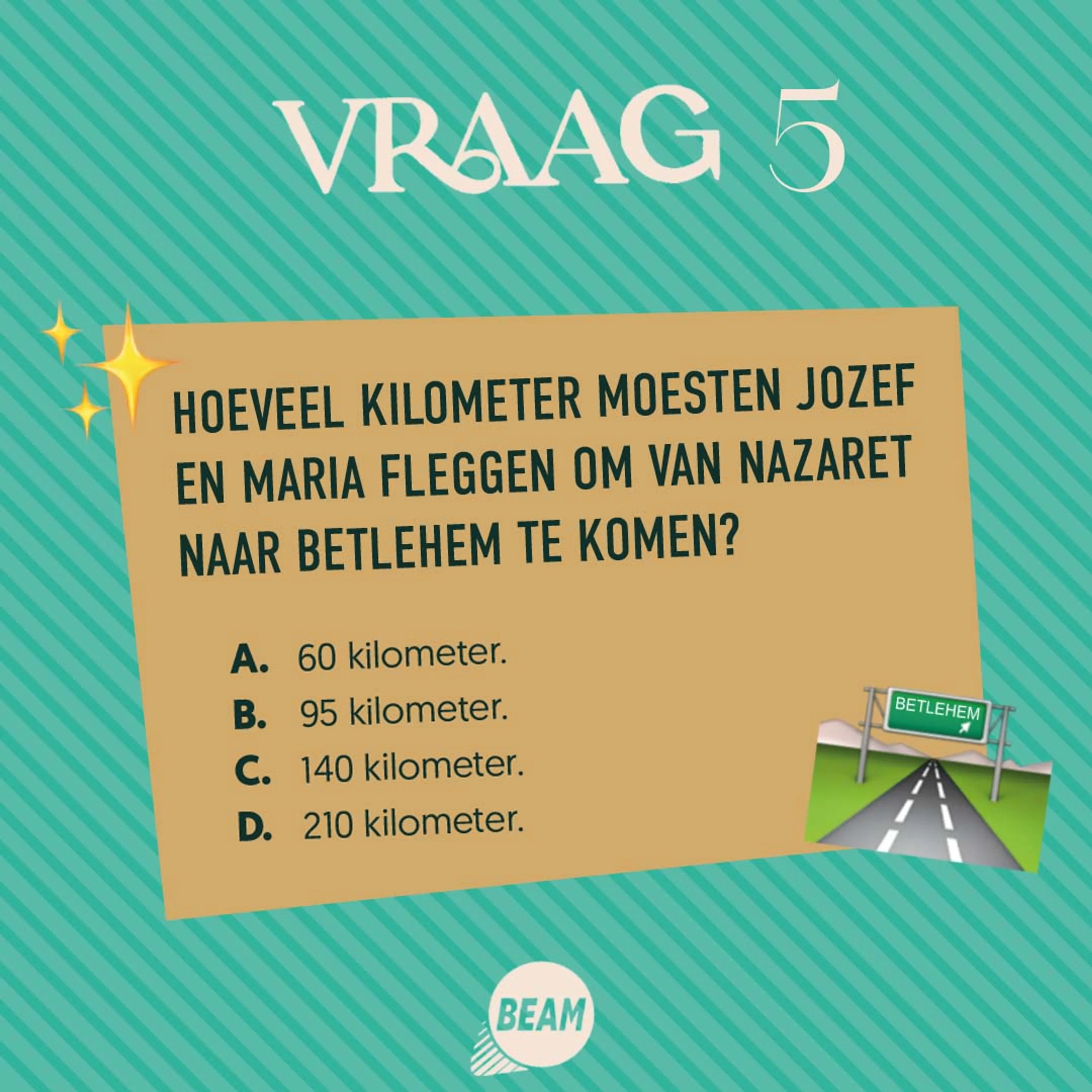 Waarschijnlijk hebben Jozef en Maria er een week over gedaan om 140 kilometer te lopen. Wist je trouwens dat de ezel die altijd bij Jozef en Maria wordt afgebeeld, helemaal niet wordt genoemd in de Bijbel? Het was in die tijd wel gebruikelijk om met een ezelte reizen, dus eigenlijk kunnen we ervan uitgaan dat Maria niet dat hele eind met een zwangere buik heeft gelopen.