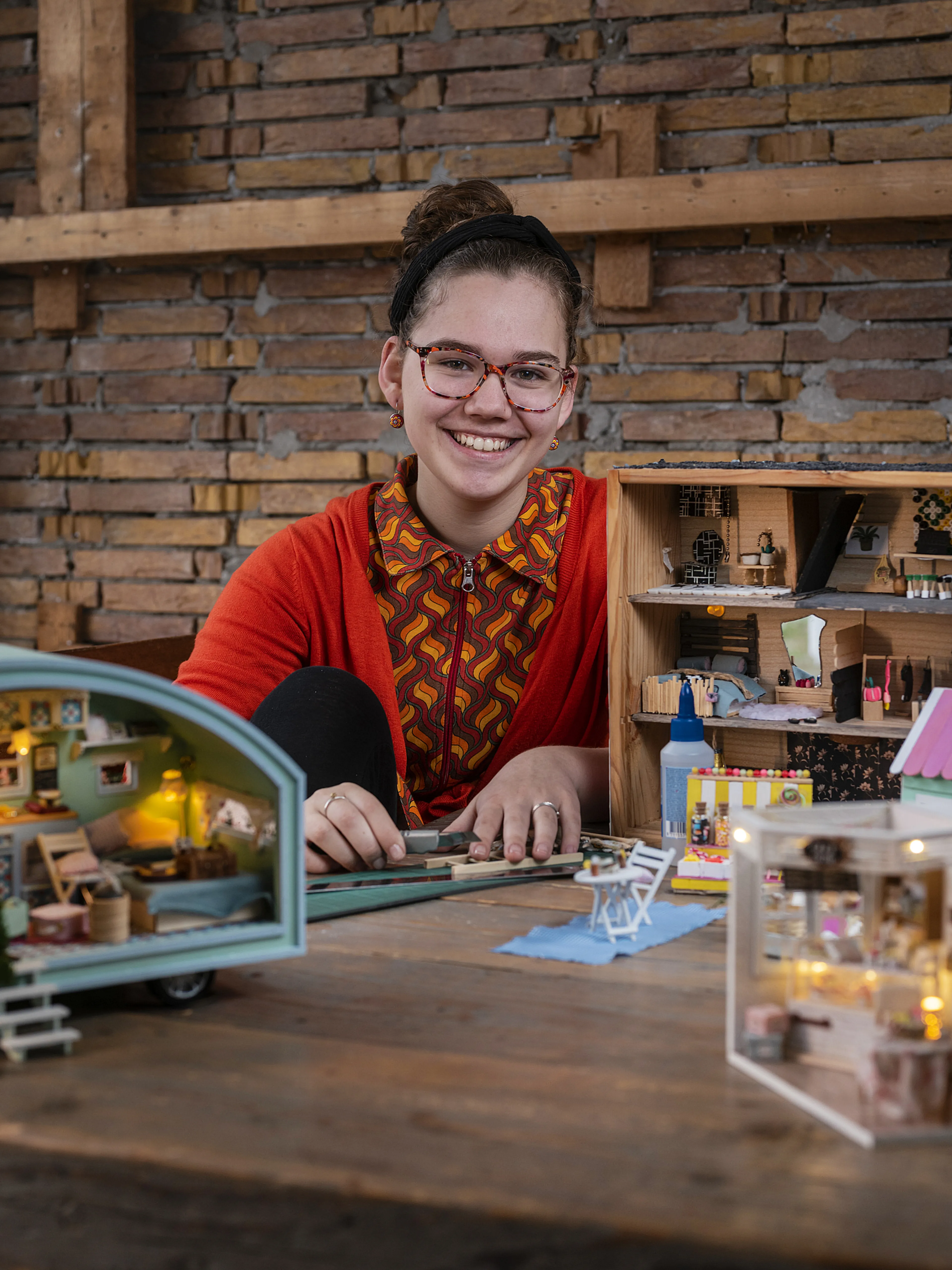 “Vier jaar geleden kwam ik op Pinterest allerlei plaatjes tegen van vette, zelfgemaakte boomhutten. Onze tuin was alleen nogal klein, dus toen ik als aanbevolen plaatje miniatuurhuisjes te zien kreeg, was dat een perfect alternatief. Mijn eerste huisje maakte ik in een klein koffertje, zoals ik ook op Pinterest had gezien. Ik begon op Instagram accounts te volgen voor inspiratie en vroeg mijn handige vader af en toe om tips, wanneer ik met hout of verf bezig ging. Vergeleken met de huisjes die ik nu maak, was mijn eerste poging een bij elkaar geraapt zooitje van wat ik maar kon vinden in huis. Nu heeft elk huisje een thema: modern, zwart-wit of een landelijke stijl met allemaal lichte kleuren. Een wijnkistje waar ooit twee flessen wijn in zaten, wordt een huisje dat bestaat uit twee verdiepingen. Dan plak ik behang op de zijkantjes, maak ik kamerindelingen met houten schotjes en knutsel ik lampenkapjes van dopjes. Ik probeer de meeste meubels zelf te maken. Inmiddels ben ik met huisje nummer acht bezig en heb ik zelfs mijn zusjes aangestoken met deze leuke hobby. Een project waar ik nog van droom, is het opknappen en inrichten van een oud poppenhuis.”