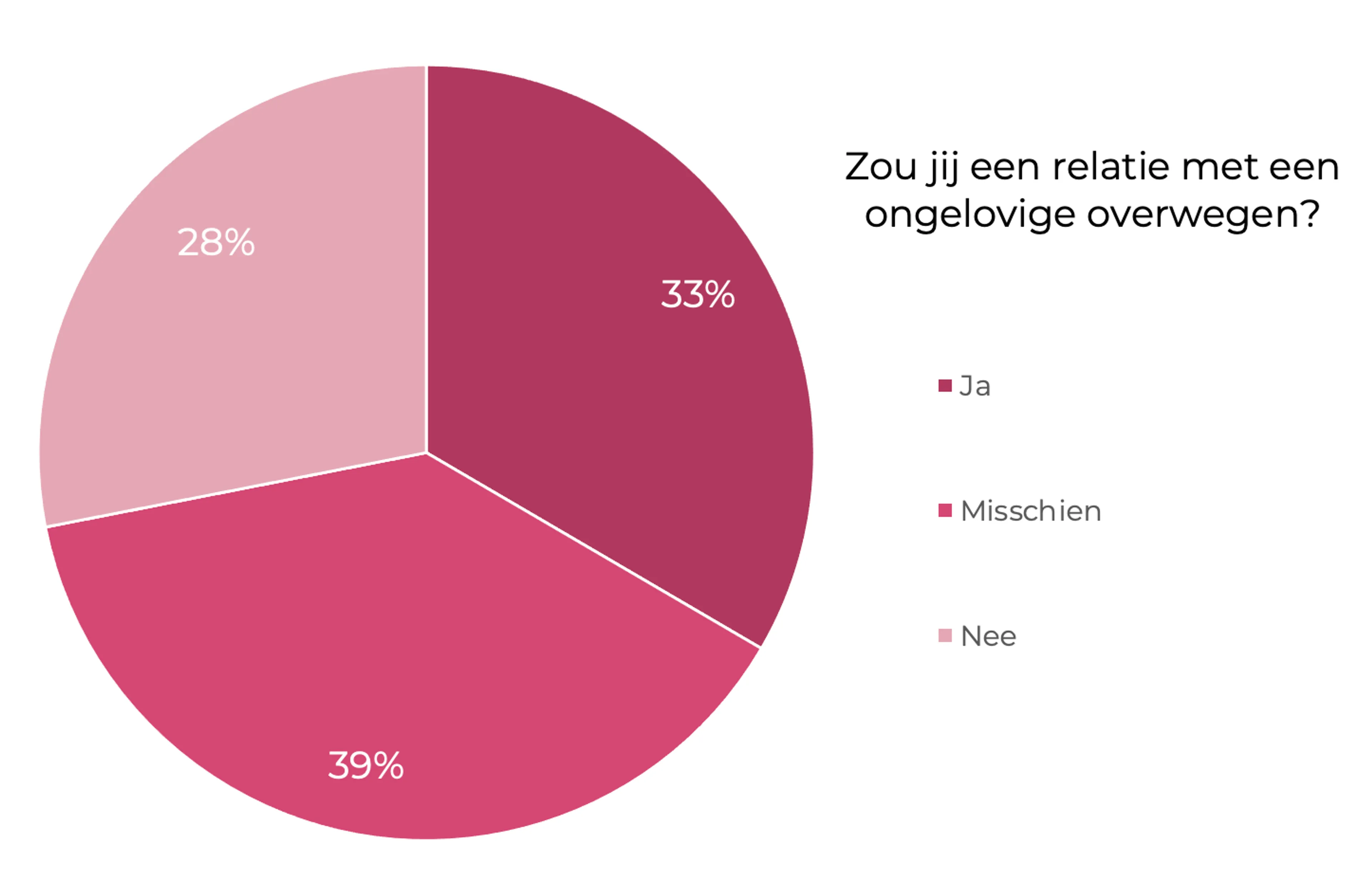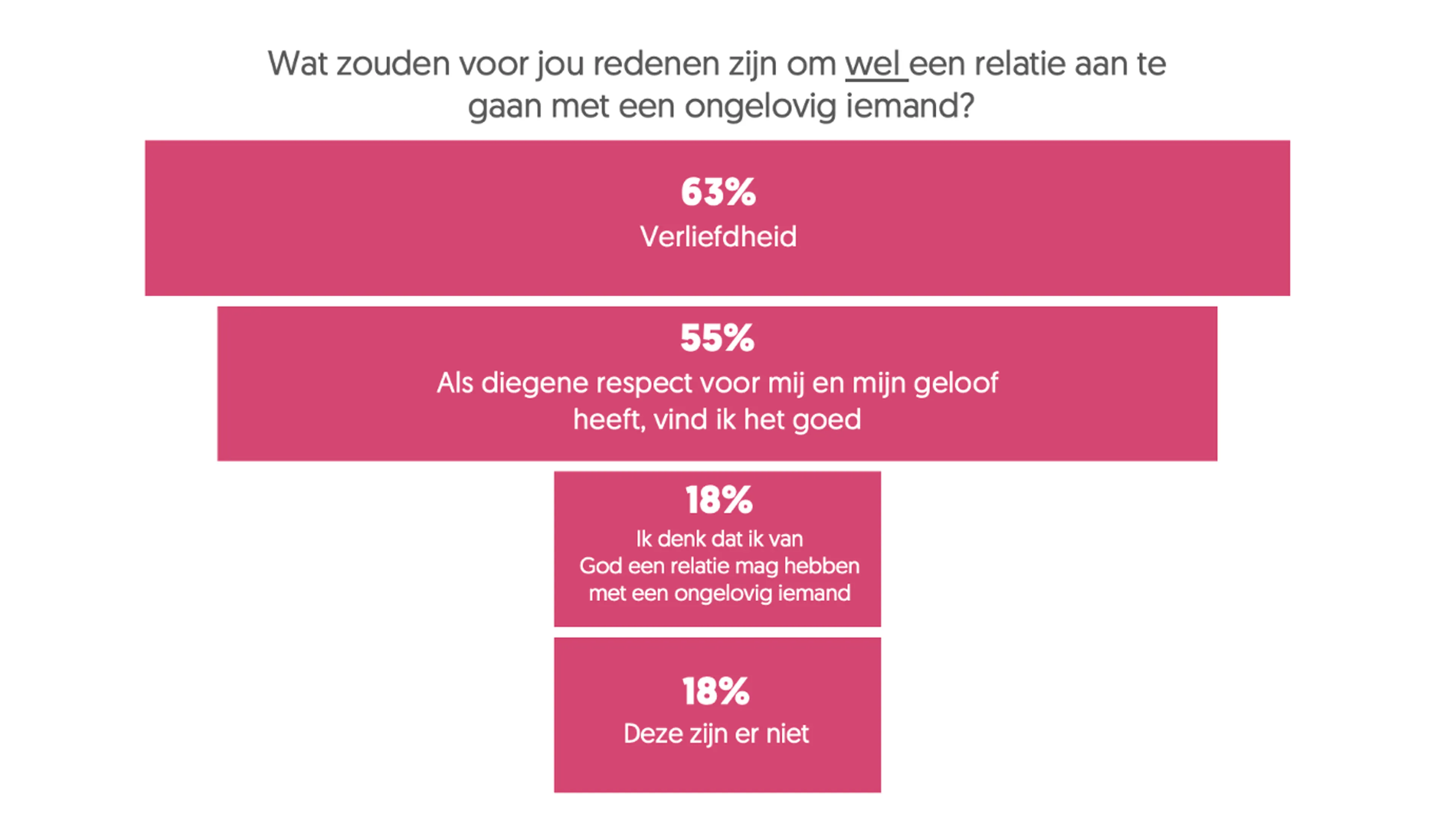 Uit de cijfers blijkt dat van de christelijke jongeren 28% geen relatie met een ongelovige zou overwegen. Het percentage ongelovige jongeren die geen relatie met een christen zouden overwegen ligt veel lager, namelijk 8%.