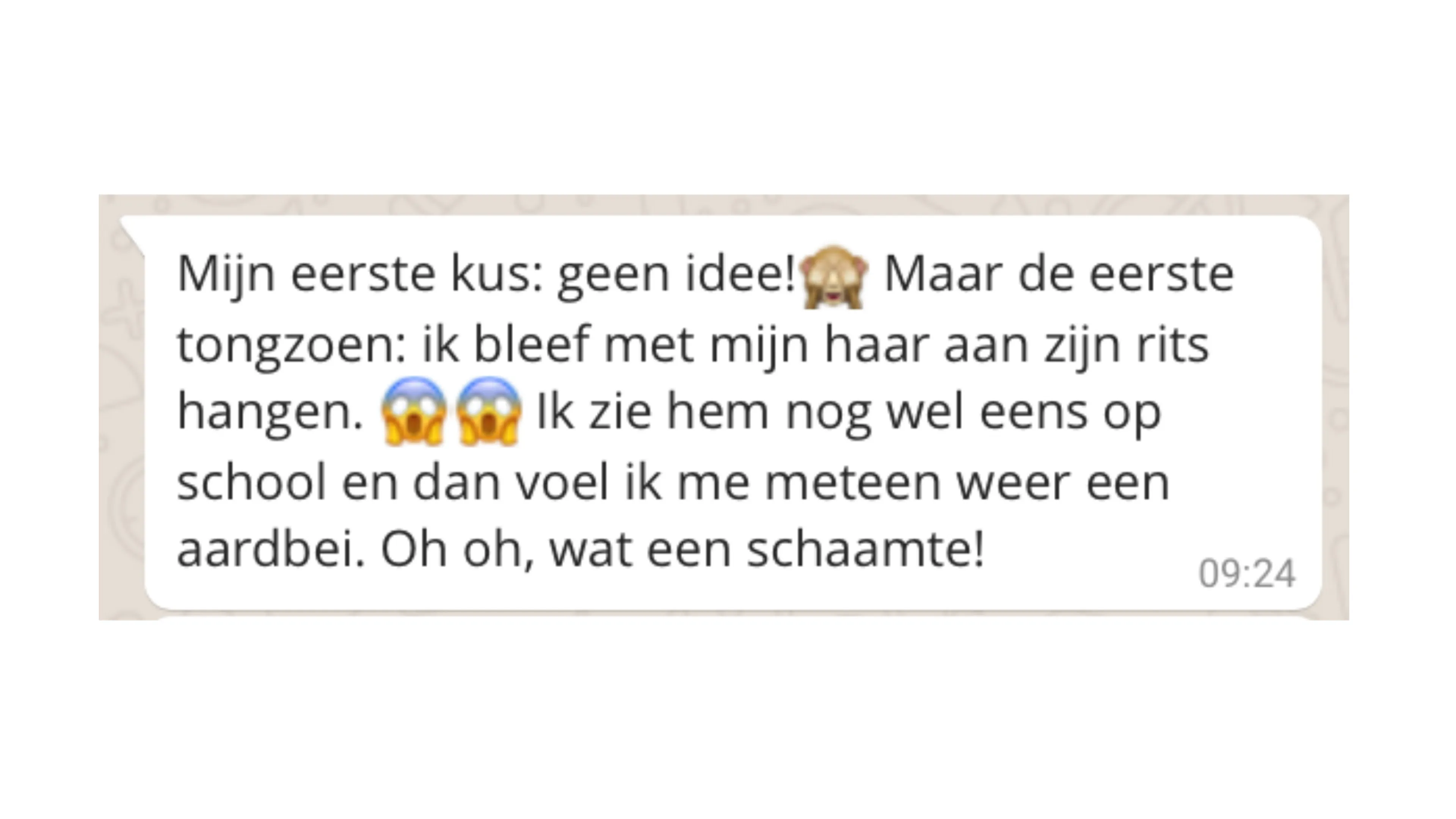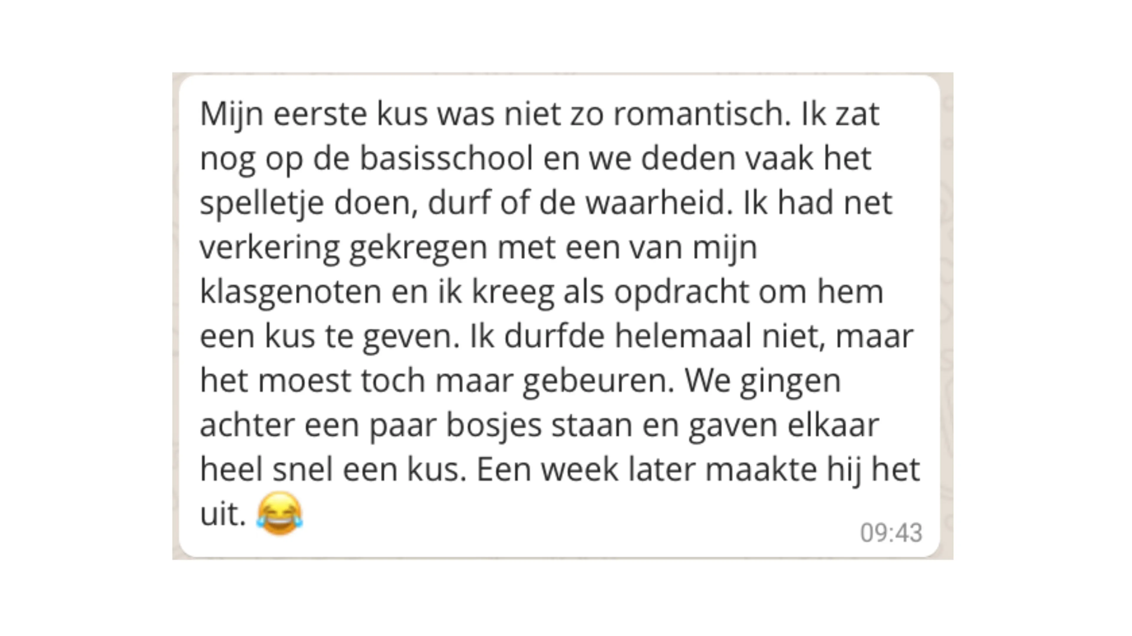 In deze rubriek stellen we een vraag over liefde, lust, seks of geheimen, die jij vervolgens heerlijk anoniem mag beantwoorden. De vraag van deze week: hoe was je eerste zoen?