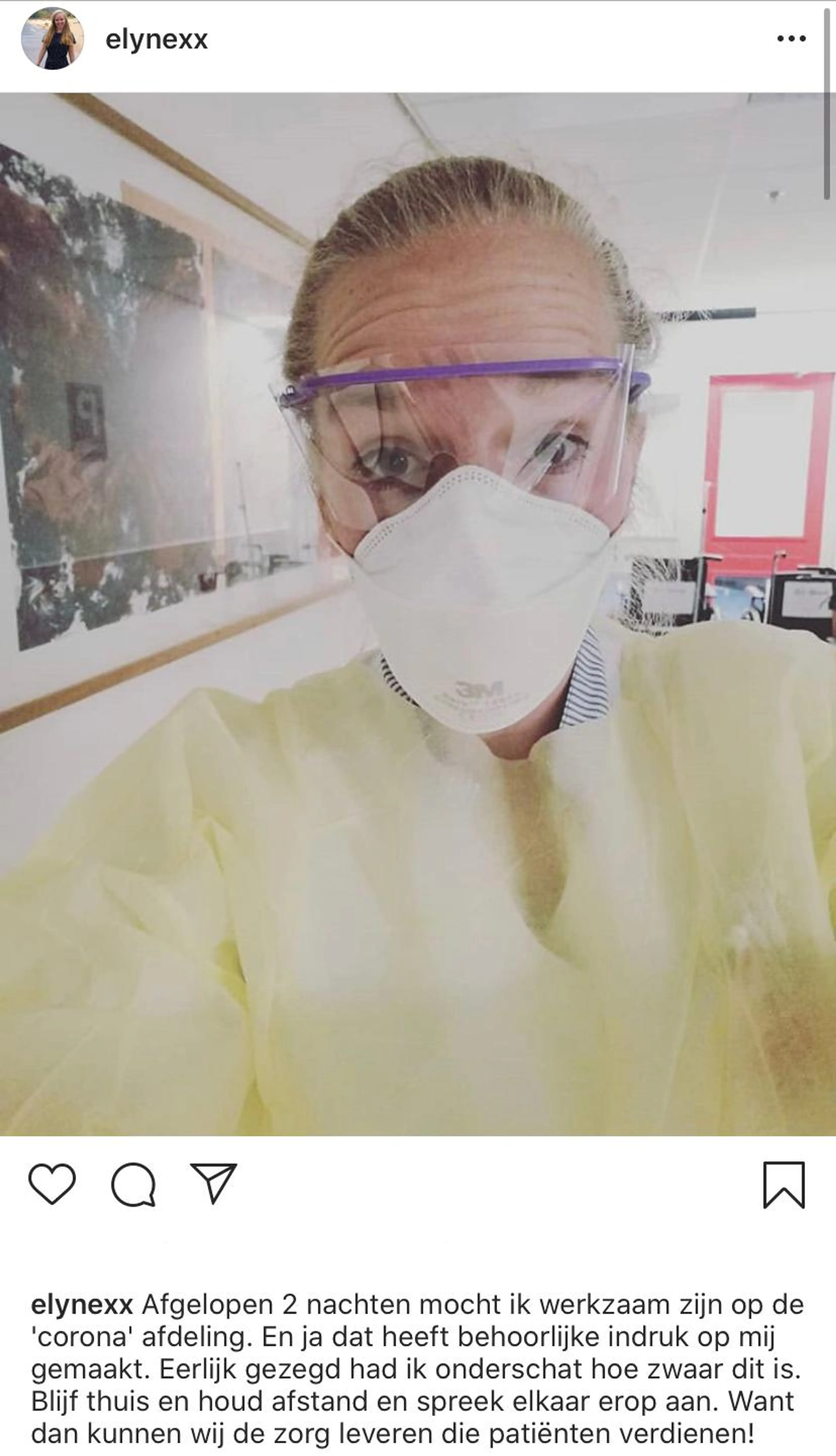 “Eerlijk gezegd maak ik me best wel zorgen over de hoeveelheid patiënten die we de komende tijd waarschijnlijk nog moeten gaan opvangen. Dat is ook dé reden dat het zo ontzettend belangrijk is dat mensen thuis blijven. Ook als het lekker weer is of als je jong bent en denkt dat de ziekte jou niet veel zal doen. Mijn collega’s en ik doen wat we kunnen en werken zonder te zeuren langer door, maar corona verslaan is iets wat we met z’n allen moeten doen. Tuurlijk heb ik gelezen over de horrorscenario’s in Italië waar ziekenhuispersoneel te weinig plek en teveel werk hadden waardoor ze moesten kiezen we ze hielpen en wie ze dood lieten gaan. Dat lijkt me echt vreselijk en dat willen we natuurlijk voorkomen. Thuis blijven is irritant, maar heel ingewikkeld is het niet. Gelukkig zijn er ontzettend veel mensen die dit al heel netjes doen. Door thuis te blijven worden mijn collega’s en ik ontzettend geholpen."
