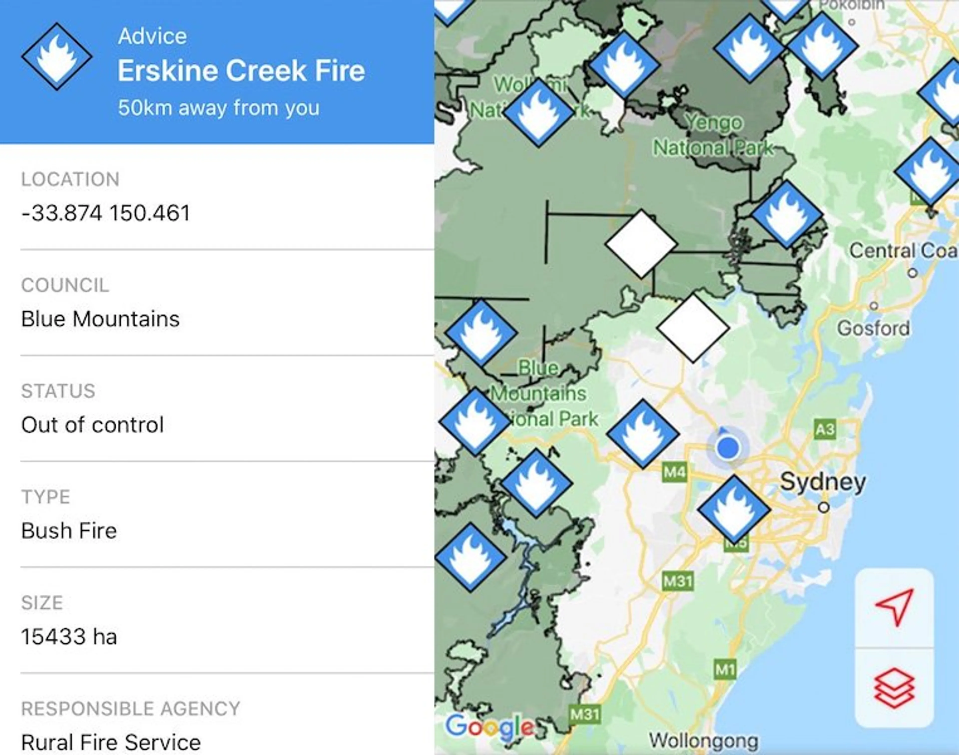 "Links zie je een voorbeeld van een melding van de brandweerdienst. Hier gaat het over een brand van 15433 hectare die 50 kilometer verderop is. Rechts zie je een landkaart, alle donkergroene plekken zijn branden. Ik woon op de plek van het blauwe puntje. Zoals je ziet worden we compleet ingesloten door de branden."