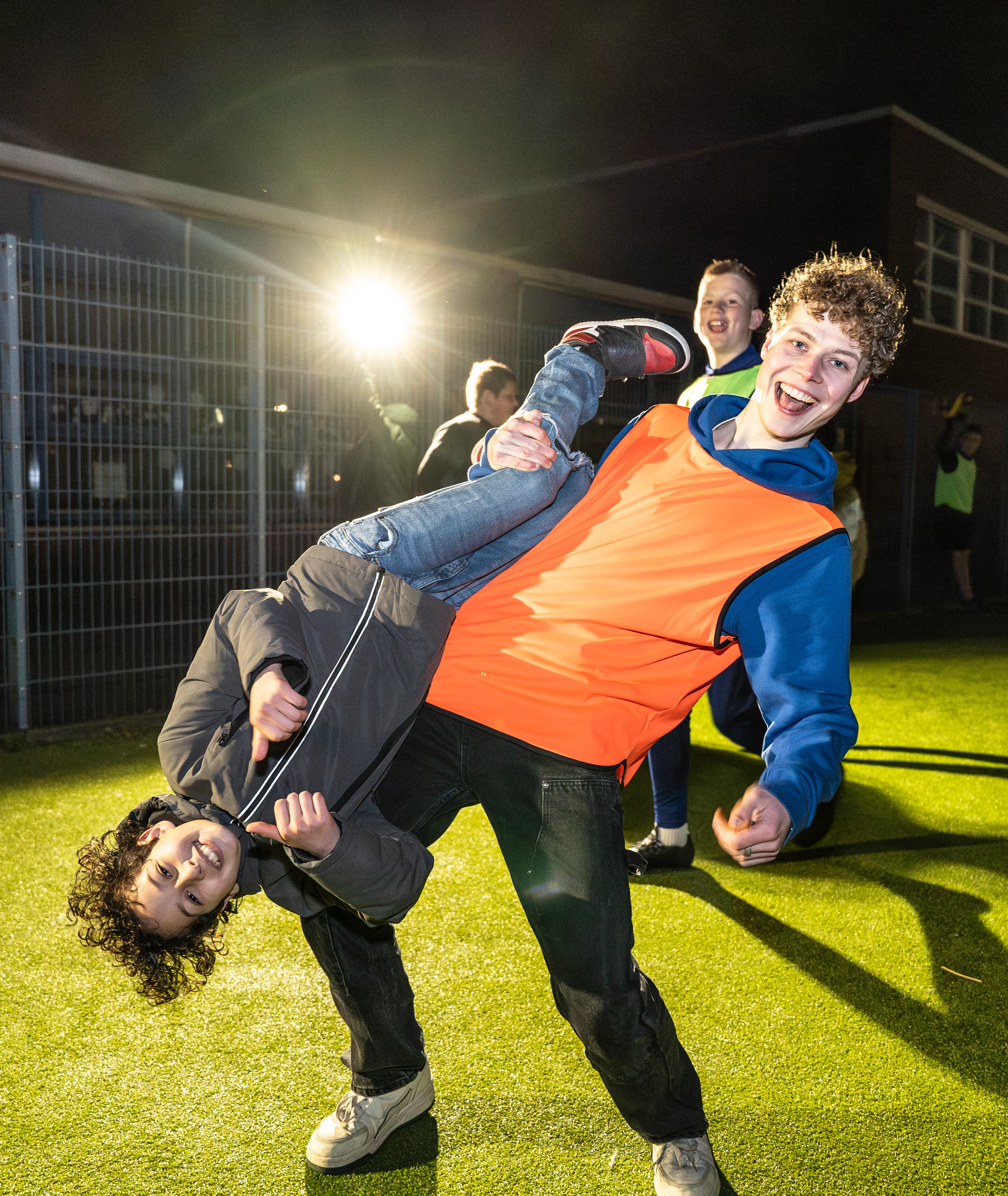 We ruimen de tafel af en iedereen hijst zich in sportkleding. Behalve ik natuurlijk… Sta ik dan, met mijn spijkerbroek. Als we naar het sportveld toelopen, zie ik dat het nog leeg is. Terwijl de vrijwilligers in elke hoek van het veld bouwlampen bevestigen tegen het donker, stroomt het vol met jongeren uit de buurt. Zo‘n dertig jongens en meiden van alle leeftijden verzamelen zich en beginnen enthousiast een balletje te trappen. Ik merk dat veel jongeren al bekend zijn bij de vrijwilligers. Ze geven handen en delen high fives uit: “Hey, te gek dat je er weer bent!”. Voordat we teams vormen, kom ik met Bente en de rest nog even bij elkaar om te bidden. Ze eindigen met een yell: “Voor de koning… AMEN!”