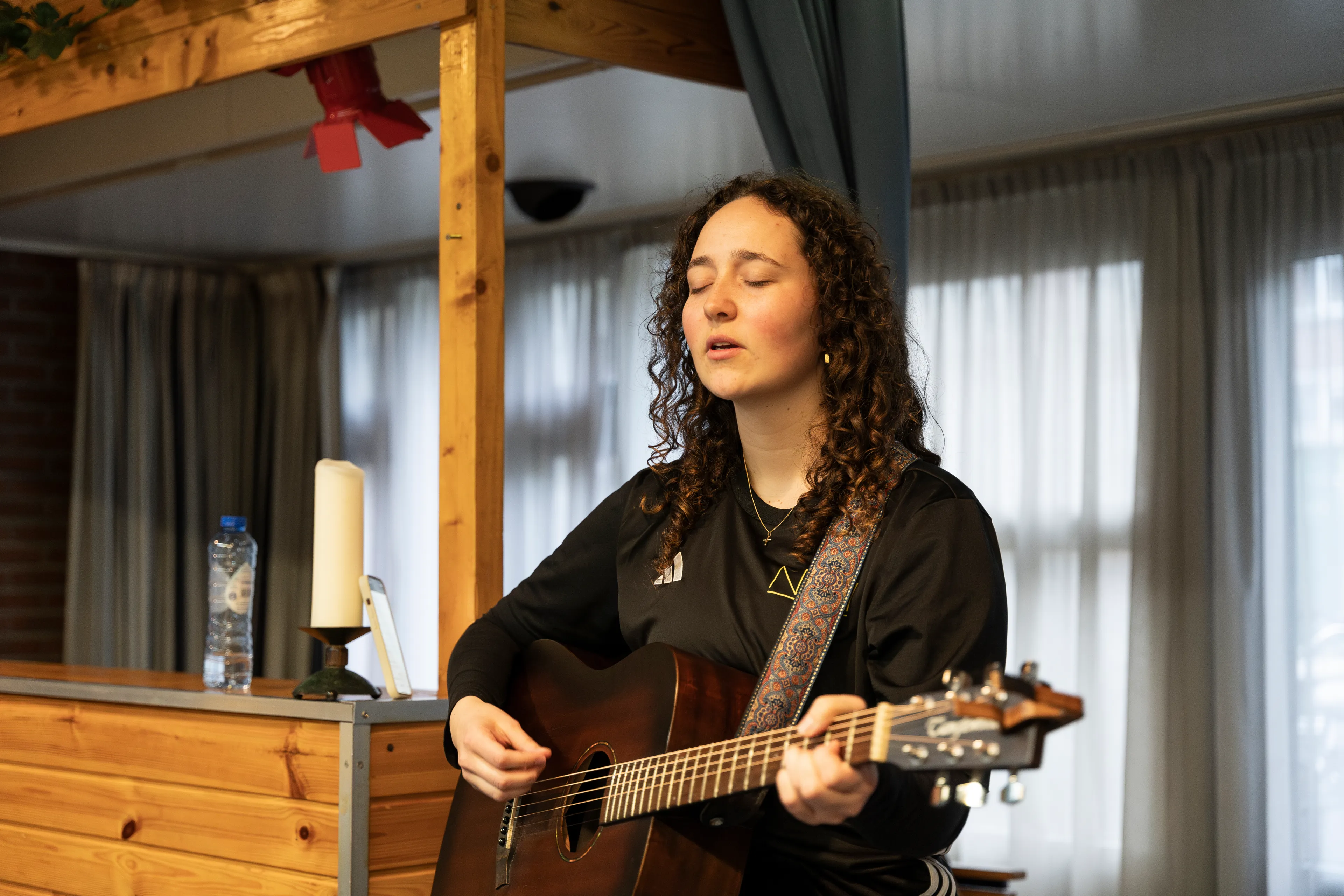 Blijkbaar lopen we achter op schema, we eten het toetje haastig op. “We hadden eigenlijk al in aanbidding moeten zitten!”, zegt Bente. Want dat doen vrijwilligers óók: samen zingen en Bijbellezen. Bente speelt een paar akkoorden en we zingen steeds een refrein van een nummer. De woorden van het lied ‘Yeshua’ vullen de ruimte, en ‘Voor altijd heilig’ volgt daarna. Tussendoor bidden we hardop, of alle zorgen op school en daarbuiten weg mogen vallen, en dat we vanavond Gods woord mogen laten doordringen bij de tieners in de wijk.