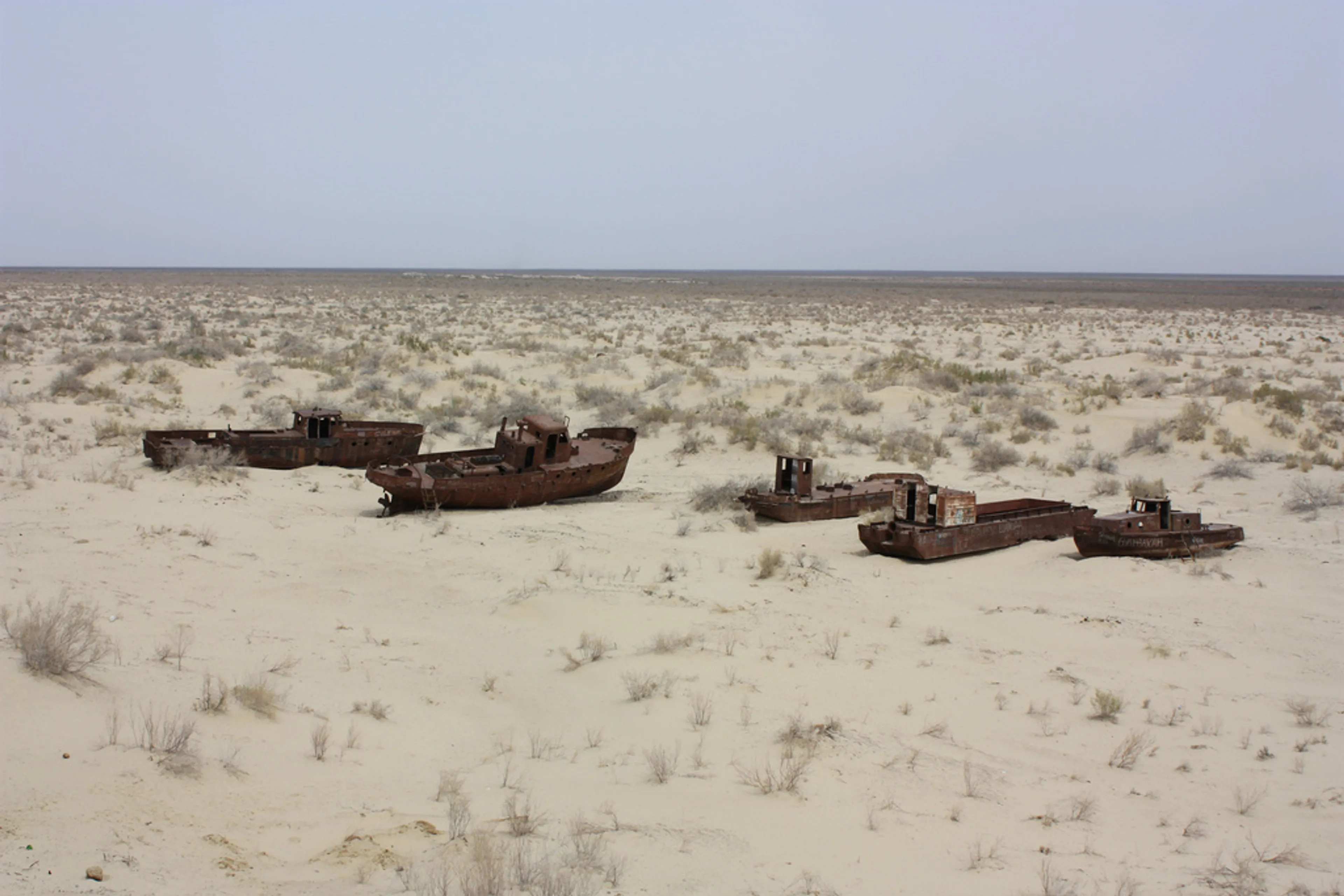Dit is het Aralmeer in Oezbekistan. Ooit was dit een prachtig meer waar veel mensen hun geld verdienden met de visvangst, maar door uitdroging is daar weinig meer van over.