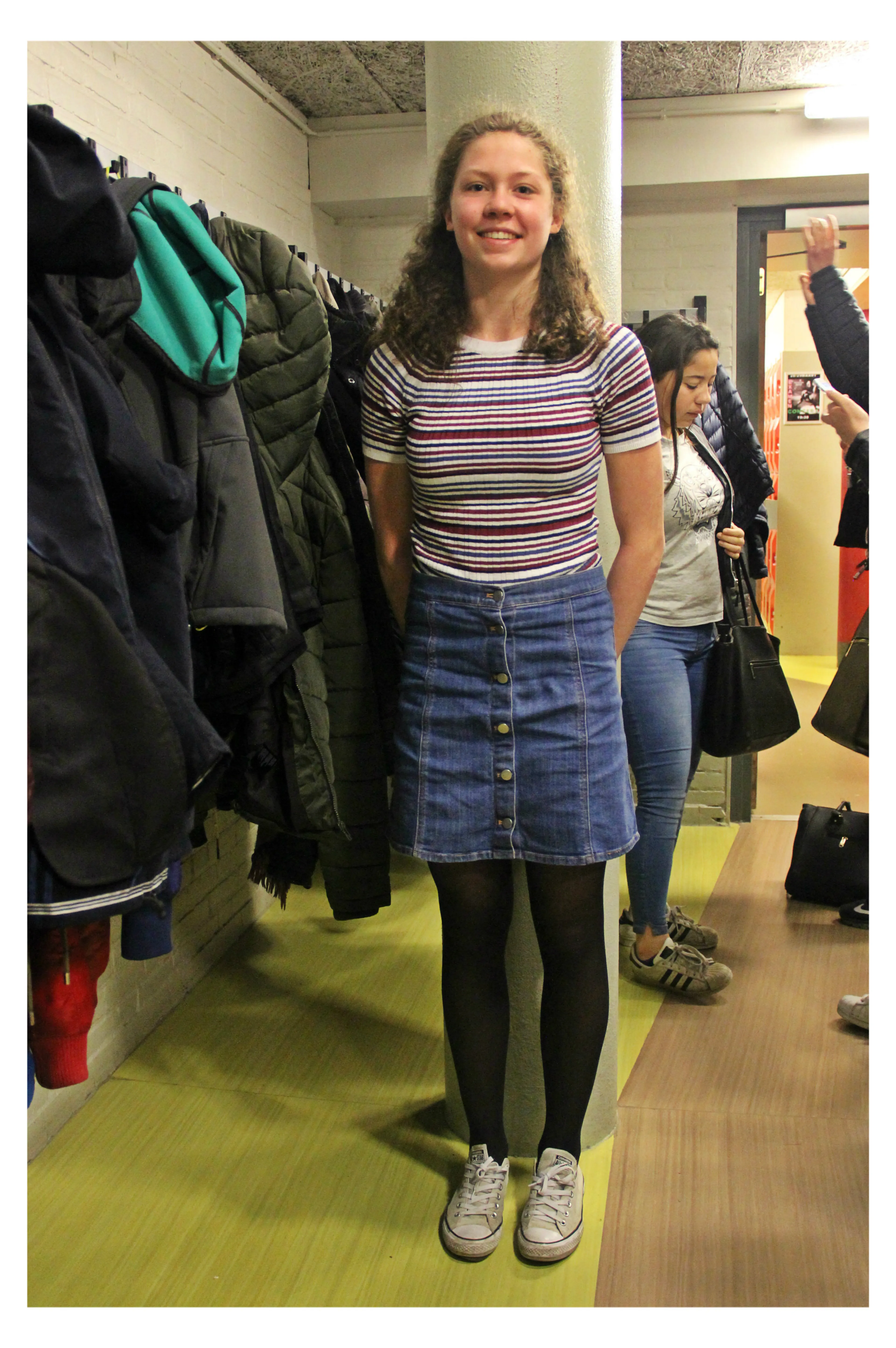 Talitha liep in de pauze met hartvormig gebak door de gangen. "Mogen we je wat vragen? Nee, we komen niet bedelen voor een stukje. We maken een fotoserie over de leukste outfits van de school." Talitha kijkt verrast: "Oh echt? Ik?"