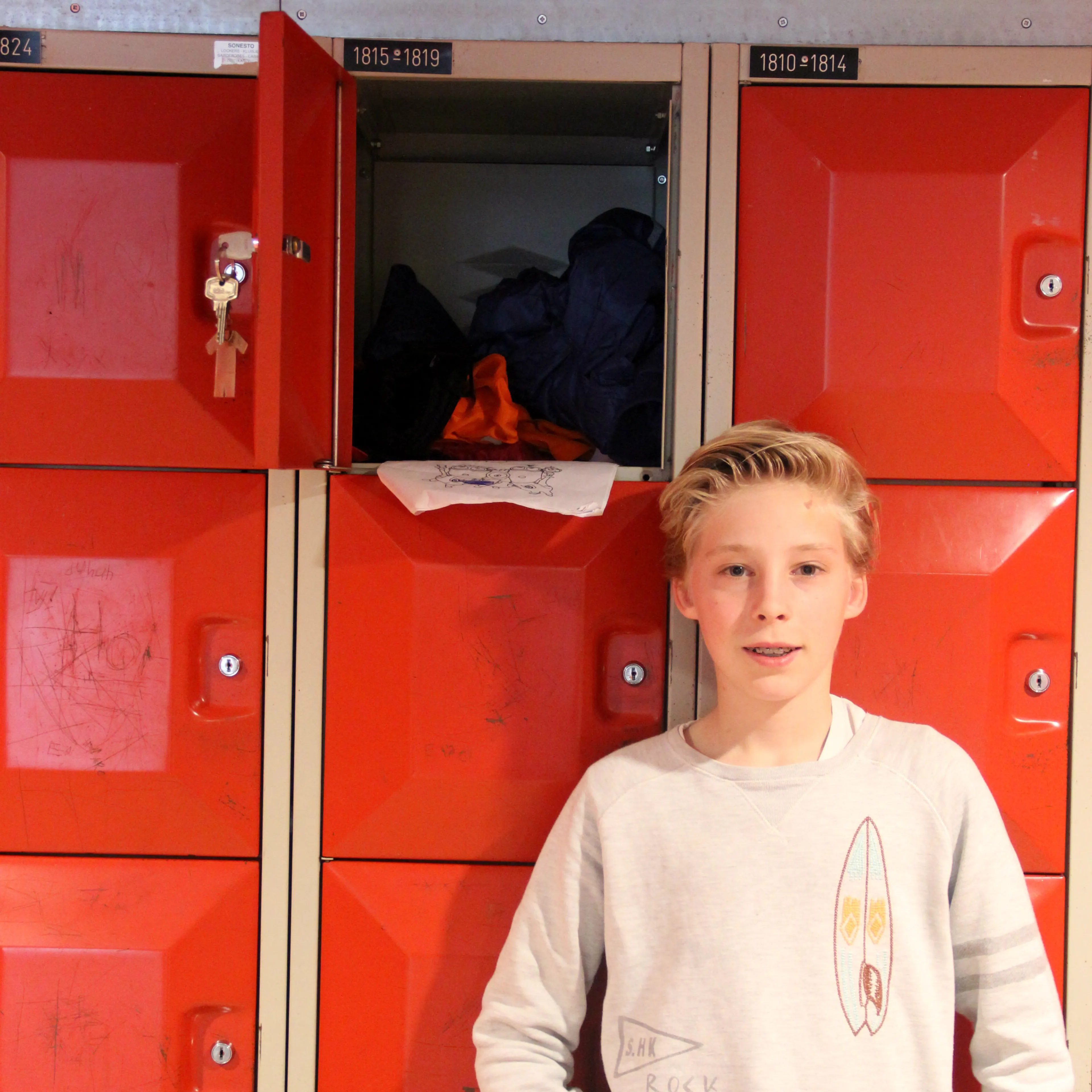 Stijn gebruikt zijn kluisje als kapstok. Hij bewaart er meestal zijn gymkleren en jas in en verder een tekening. “Ja, die is oud hoor!”