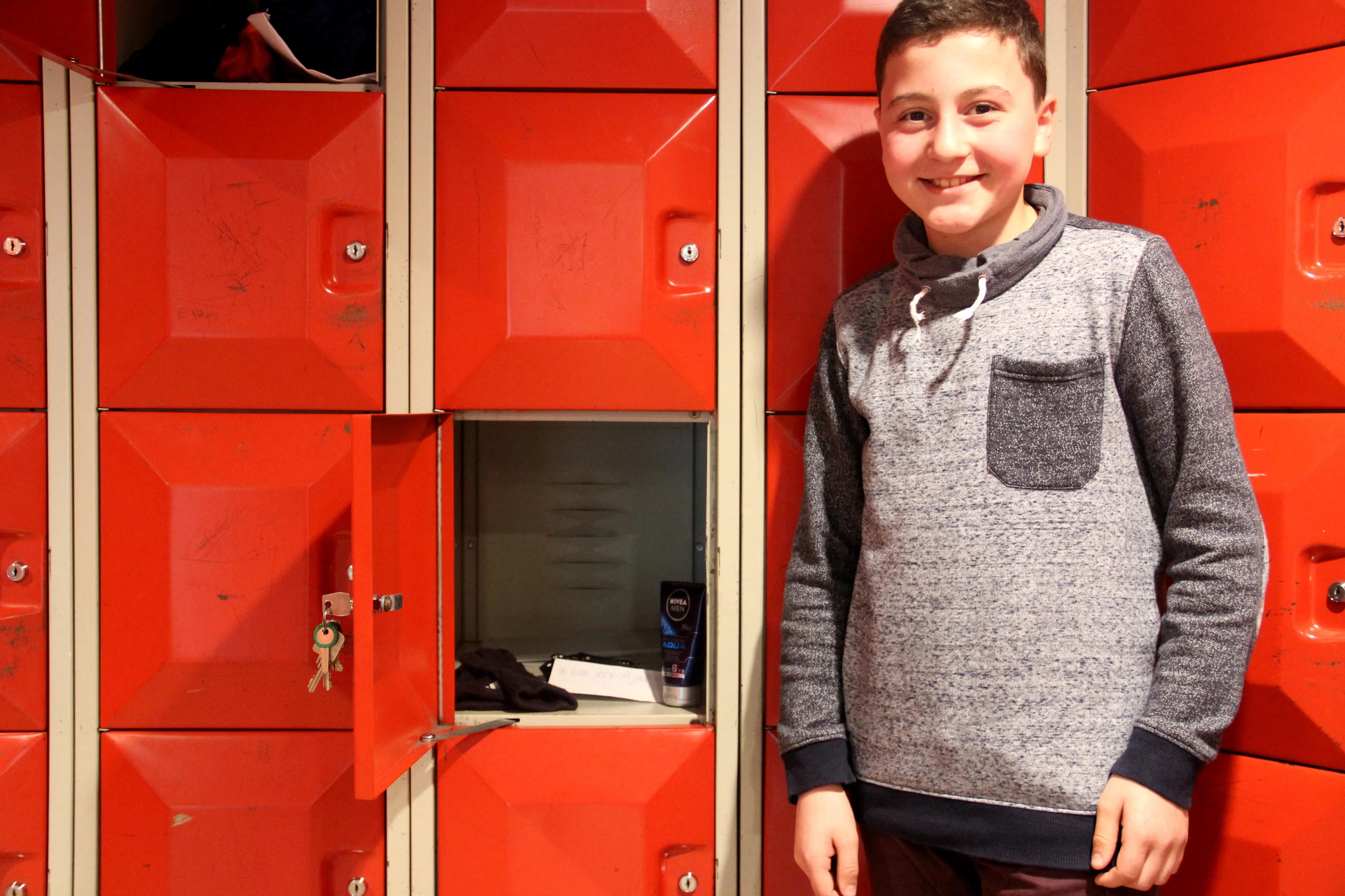 Zo ook Mohammed. Toen we hem vroegen of we zijn kluisje op de foto mochten zetten, trok hij een sprintje naar de conciërge om de loper te lenen. Ook hij was zijn sleutel al een tijdje kwijt. Wat stopt hij er dan in? Mohammed is graag op de toekomst voorbereid en heeft dus gel en handschoenen in zijn kluisje gestopt.