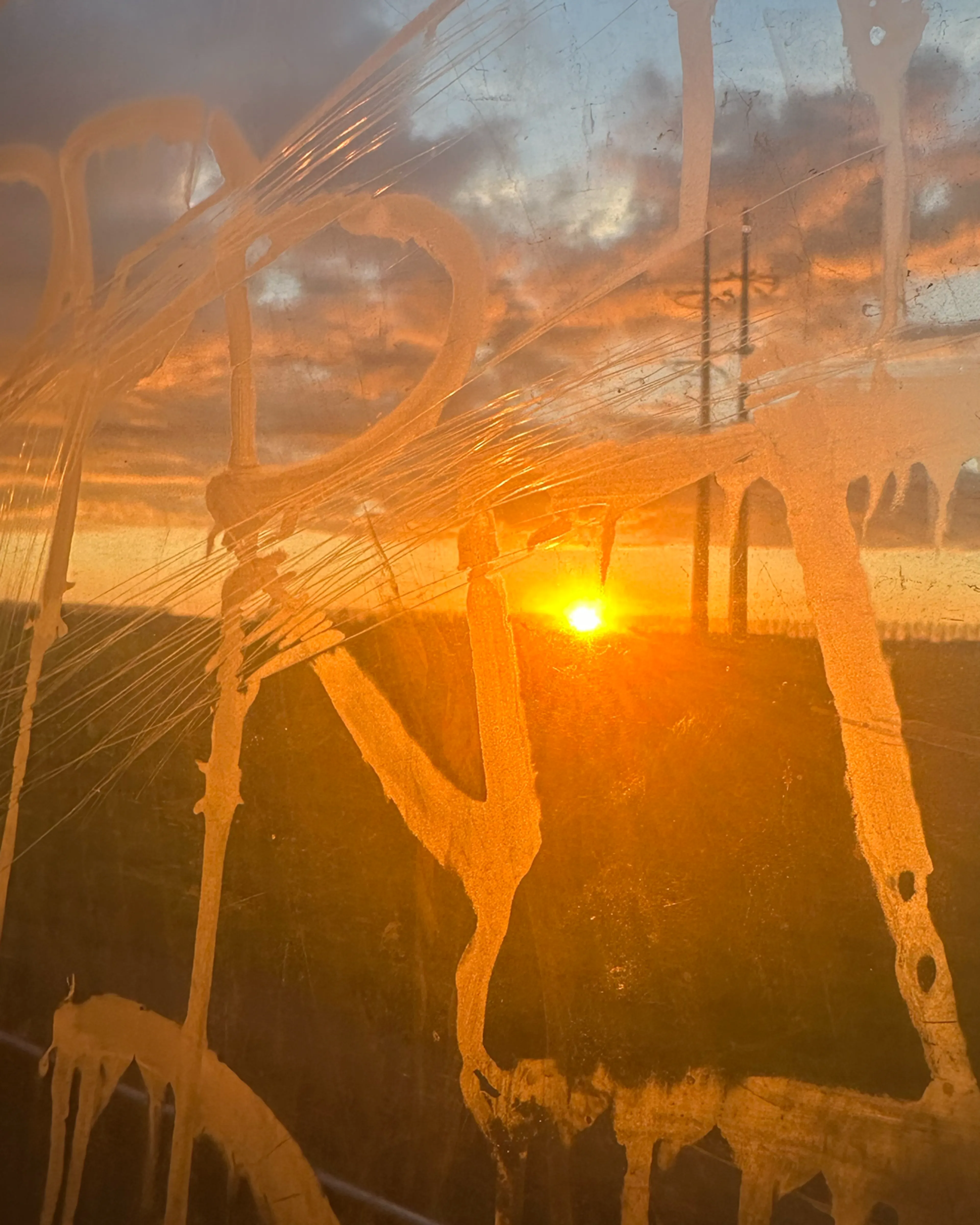 Maar wat betekent dat nou voor mij? Terwijl ik druk bezig ben met mijn telefoon. Merk ik op dat een oranje gloed via mijn scherm in mijn gezicht reflecteert. Ik kijk op. En wat ik zie? Is een kunstwerk. Door een met foeilelijke graffiti volgespoten mini raampje zie ik de prachtigste zonsondergang. Help ik begin emotioneel te worden. Dit. Dit is de betekenis van Pasen.