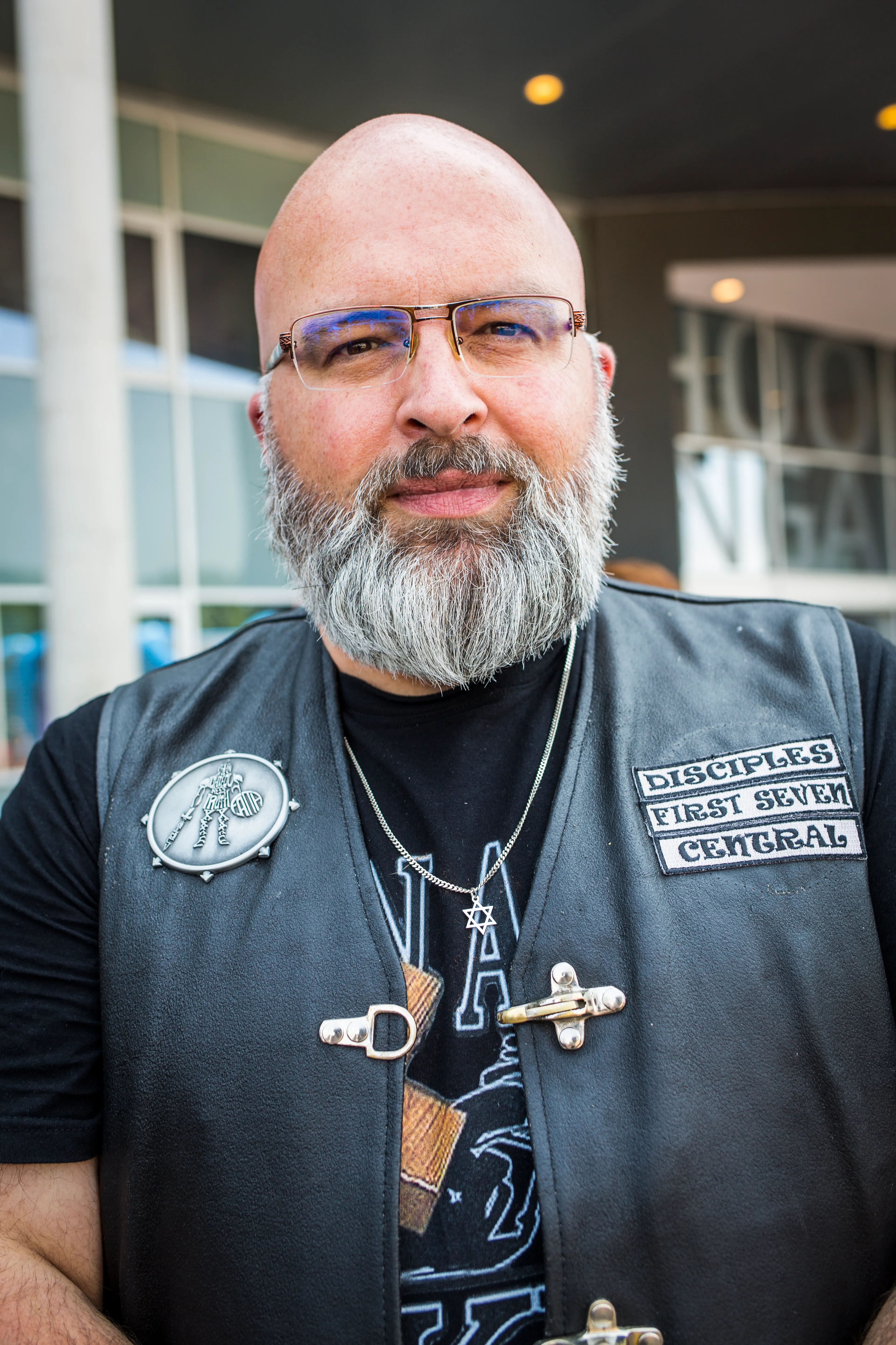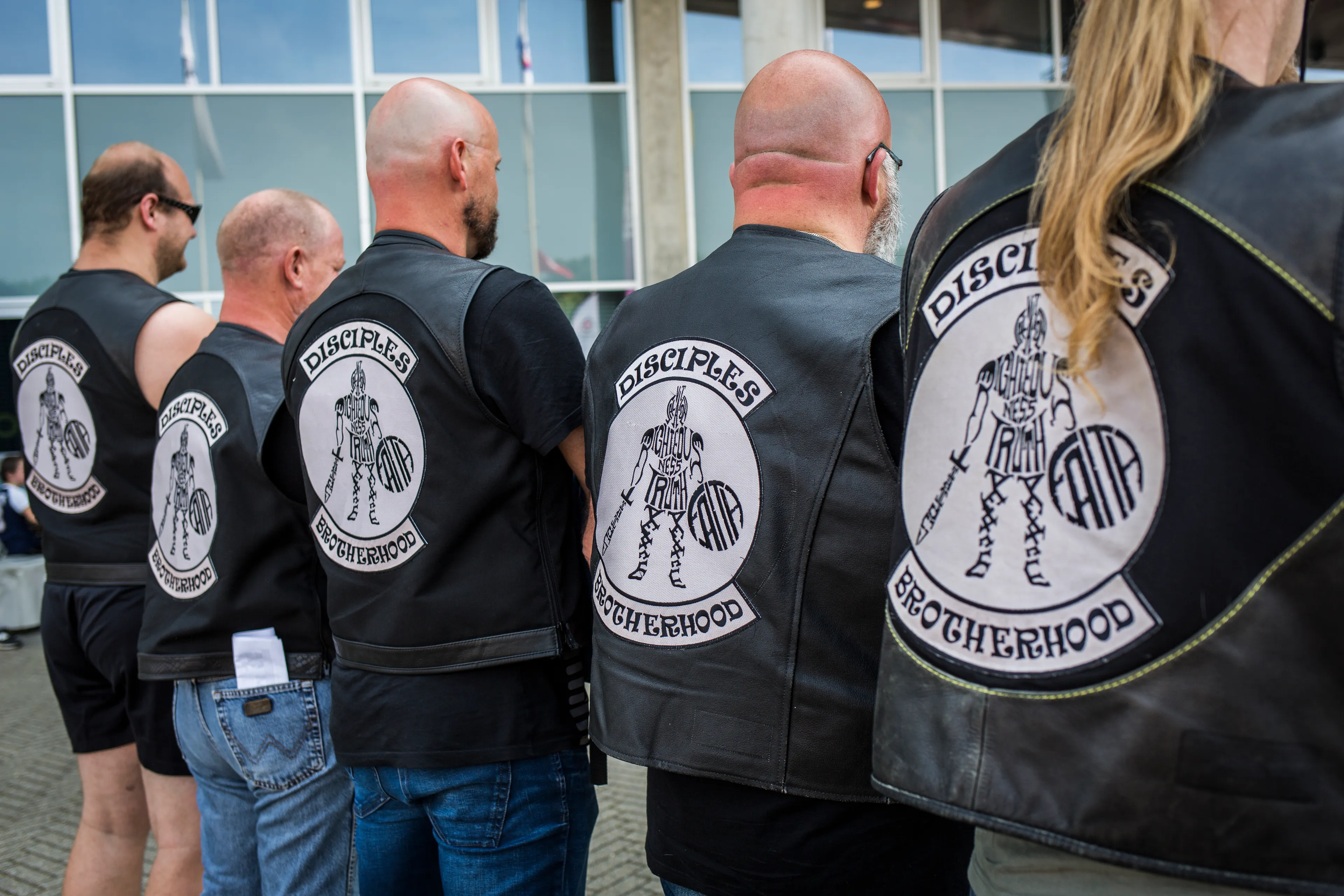 Tussen alle enthousiaste, jonge en veelkleurige BEAM’ers loopt een aantal leden van de Disciples rond op het buitenterrein. De mannen zijn eerder op de dag wel even in het stadion geweest, maar: “Eerlijk gezegd vond ik de bas een beetje hard. Ja, dat klinkt gek uit de mond van een motorrijder, hè?”. Dus genieten ze nu lekker van het zonnetje. Als er gevraagd wordt wie er wat over de motorclub wil vertellen, wordt André naar voren geschoven. “Wij wilden onze passie voor God en onze hobby – motorrijden - met elkaar combineren. Wij zijn dus een christelijke club. Dat zie je ook terug op onze vesten: enerzijds in onze naam Disciples, maar ook in het logo.”
