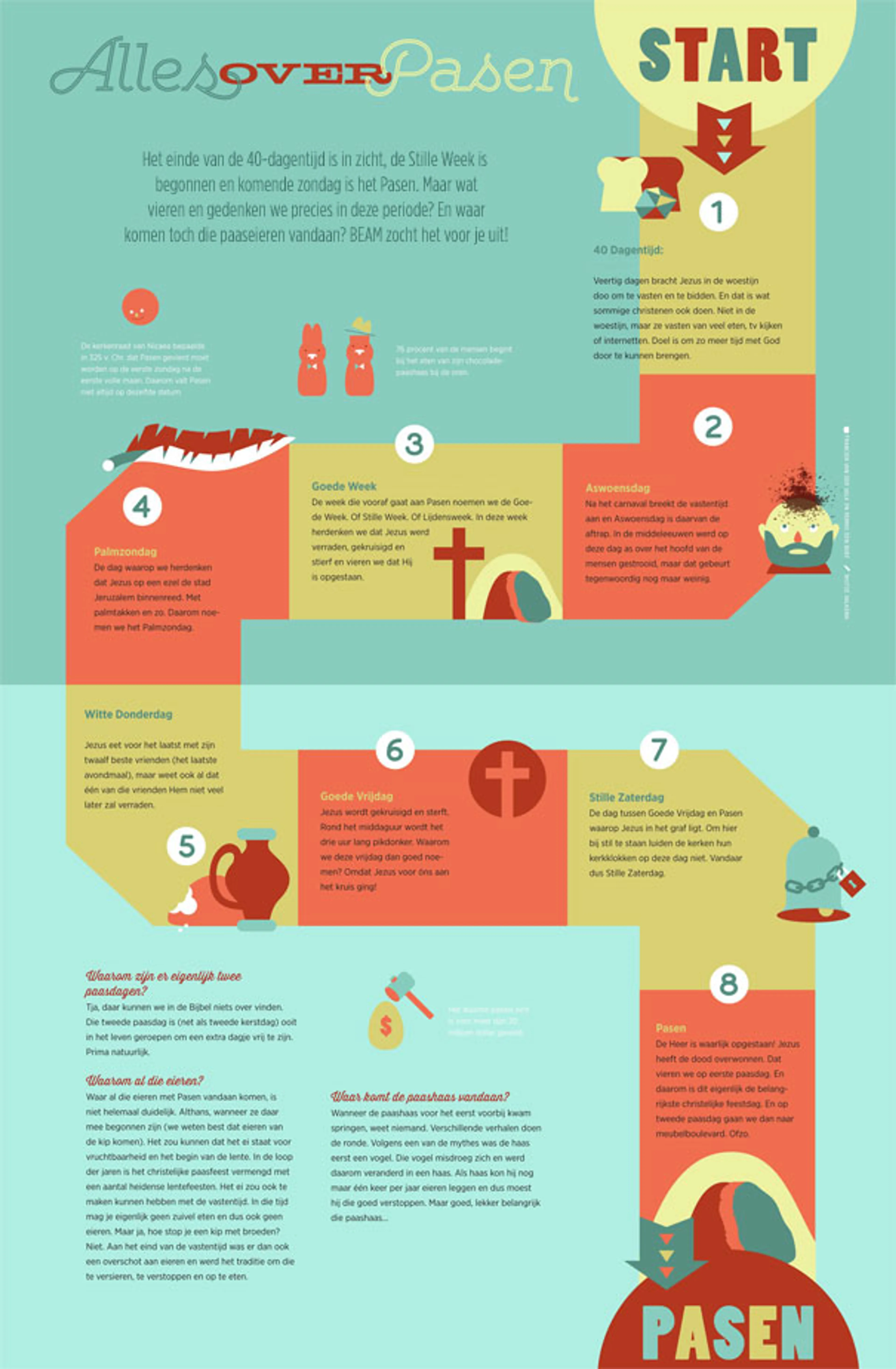 Het einde van de 40-dagentijd is in zicht, de Stille Week is begonnen en komende zondag is het Pasen. Maar watvieren en gedenken we precies in deze periode? En waarkomen toch die paaseieren vandaan? BEAM zocht het voor je uit en maakte er deze infographic van!