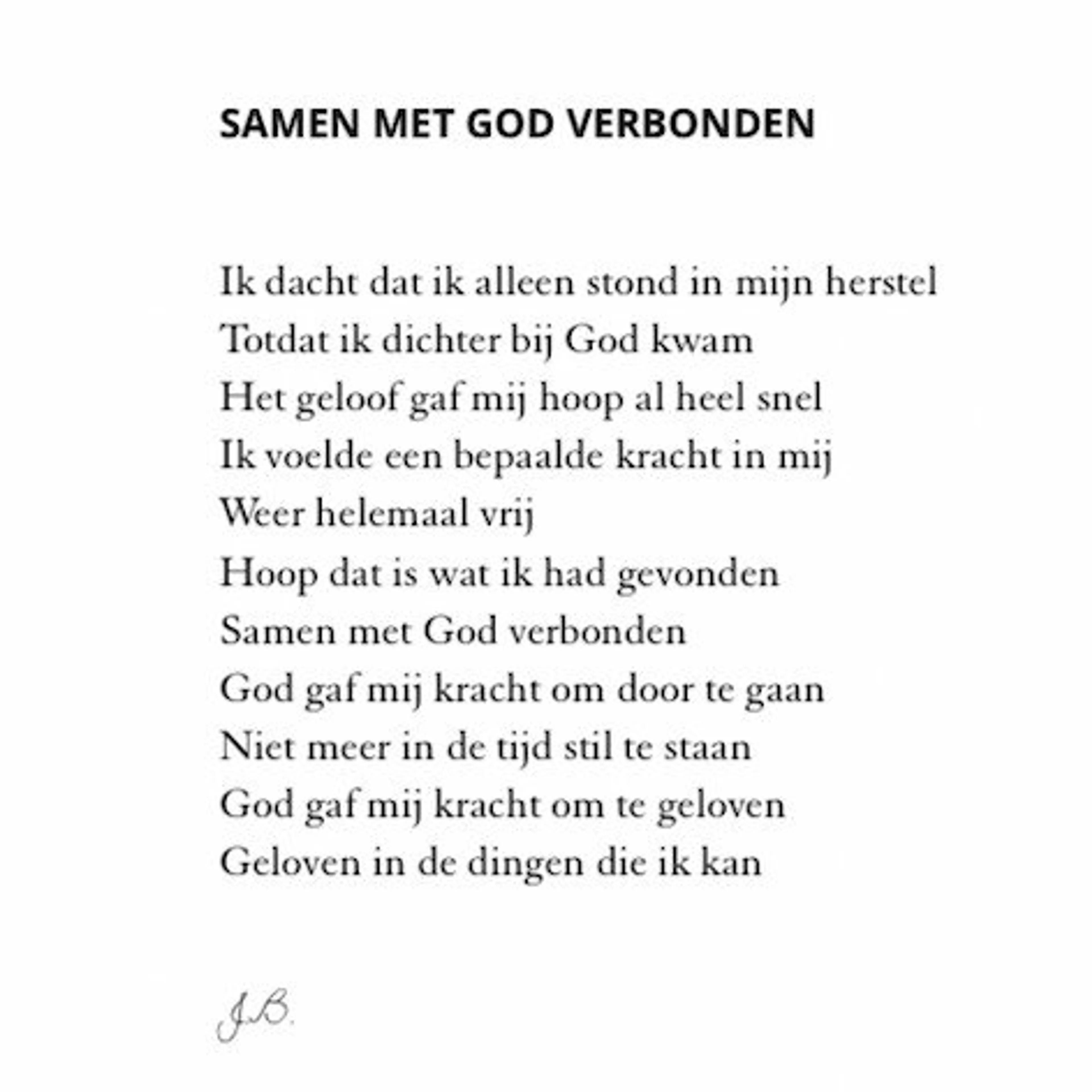 “Als ik ergens mee zit, dan schrijf ik daar gedichten over. Zo schrijf ik over God, mijn onzekerheden en mijn jeugd. Ik begon aan een gedichtenbundel en bad of God dit kon gebruiken. Op 9 april wordt mijn bundel uitgebracht, wat ik echt zie als een gebedsverhoring. Door deze gebeurtenis en het ontmoeten van een goede vriendin krijg ik steeds de bevestiging van God dat ik er mag zijn en Hij mij steunt.”
