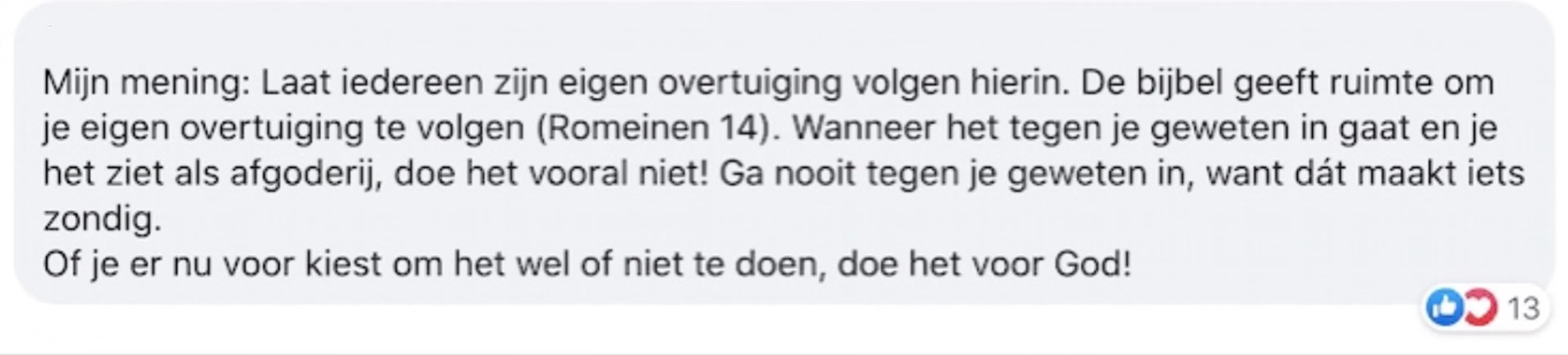 “Dit vond ik een hele mooie reactie. De Bijbeltekst in Romeinen 14 gaat over het volgen van je eigen geweten. Er wordt hierbij genoemd dat je erop moet letten dat je geen struikelblok vormt voor anderen. Ik zal nooit zeggen dat anderen yoga moeten doen. Maar God geeft ons de ruimte om je eigen overtuiging te volgen. Als het tegen je eigen geweten ingaat, doe het dan niet. Maar wat je ook kiest, doe het voor God.”