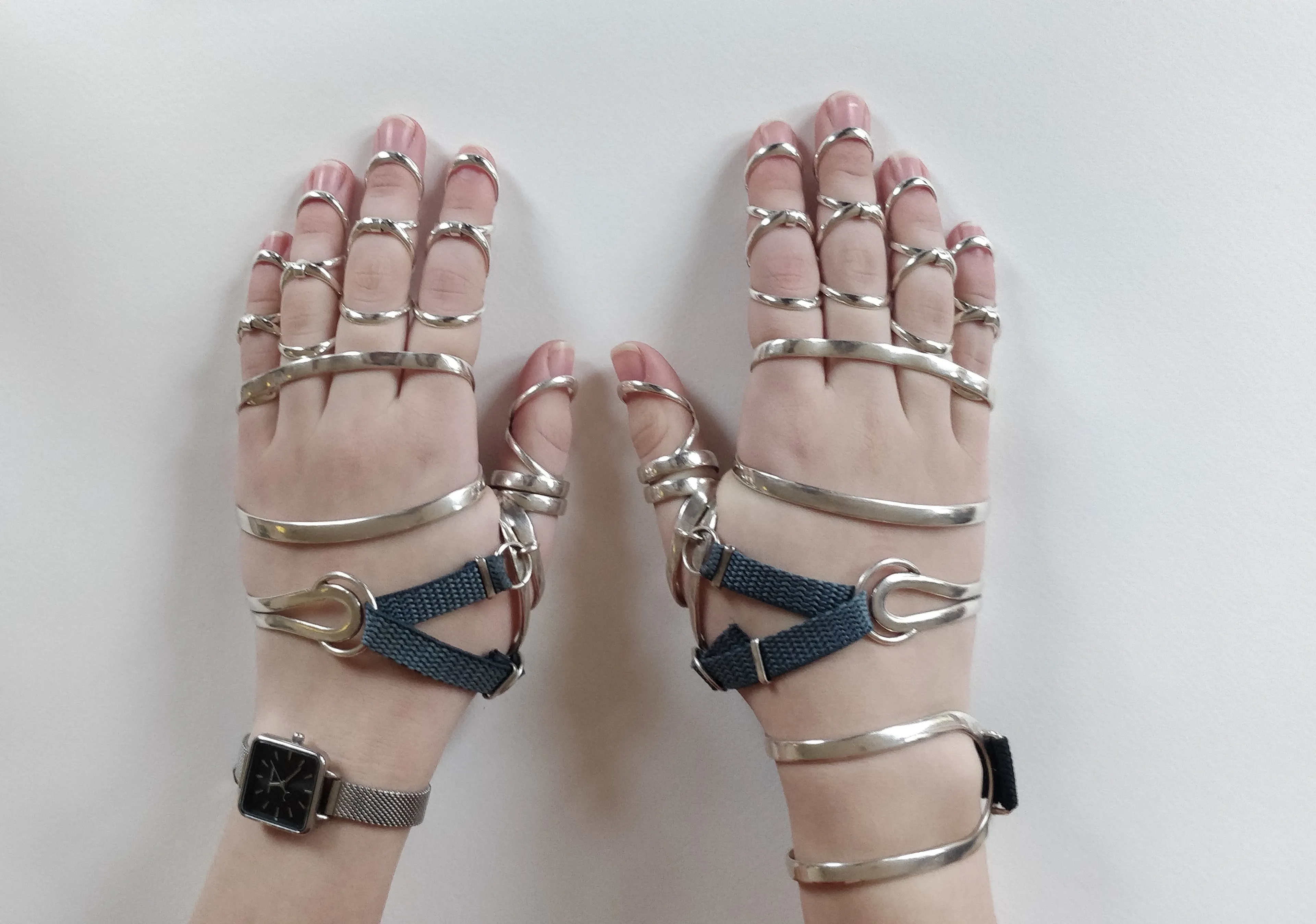 Sindsdien ben ik eigenlijk altijd moe. In maart 2020 heb ik de diagnose Hypermobiel Ehlers Danlos Syndroom gekregen. Ik had dat vermoeden al wel, dus het was niet echt een verrassing. Ik kreeg toen braces om mijn gewrichten te ondersteunen. Ik heb er een heel aantal voor mijn handen en vingers (zie de foto hieronder) en een voor mijn knieën. Hierdoor kan ik mijn vingers, duimen en pols niet overstrekken. Ook heb ik orthopedische schoenen. Door die schoenen en de braces om mijn knie kan ik wat sneller lopen. Met braces kan ik één kilometer lopen, zonder lukt dat niet. Binnenkort krijg ik een rolstoel met elektrische ondersteuning voor afstanden langer dan dat.”