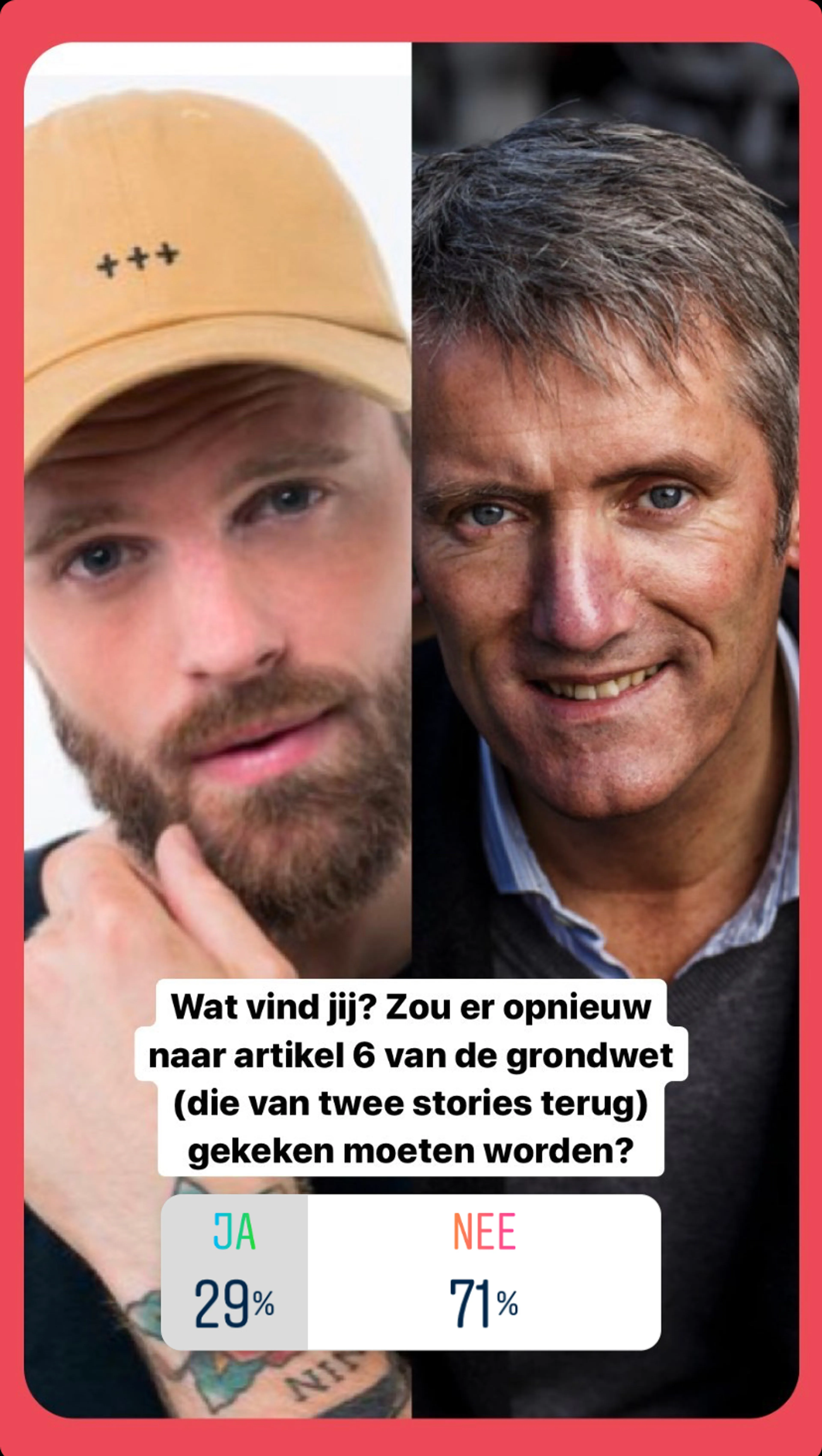 De vraag die we naar aanleiding van dit gesprek stelde op Instagram: zou er opnieuw naar dit artikel van de grondwet over godsdienstvrijheid gekeken moeten worden? Ruim 7000 jongeren zagen deze vraag voorbij komen: 29% vindt dat dit zou moeten, 71% vindt de wet goed zoals hij is.