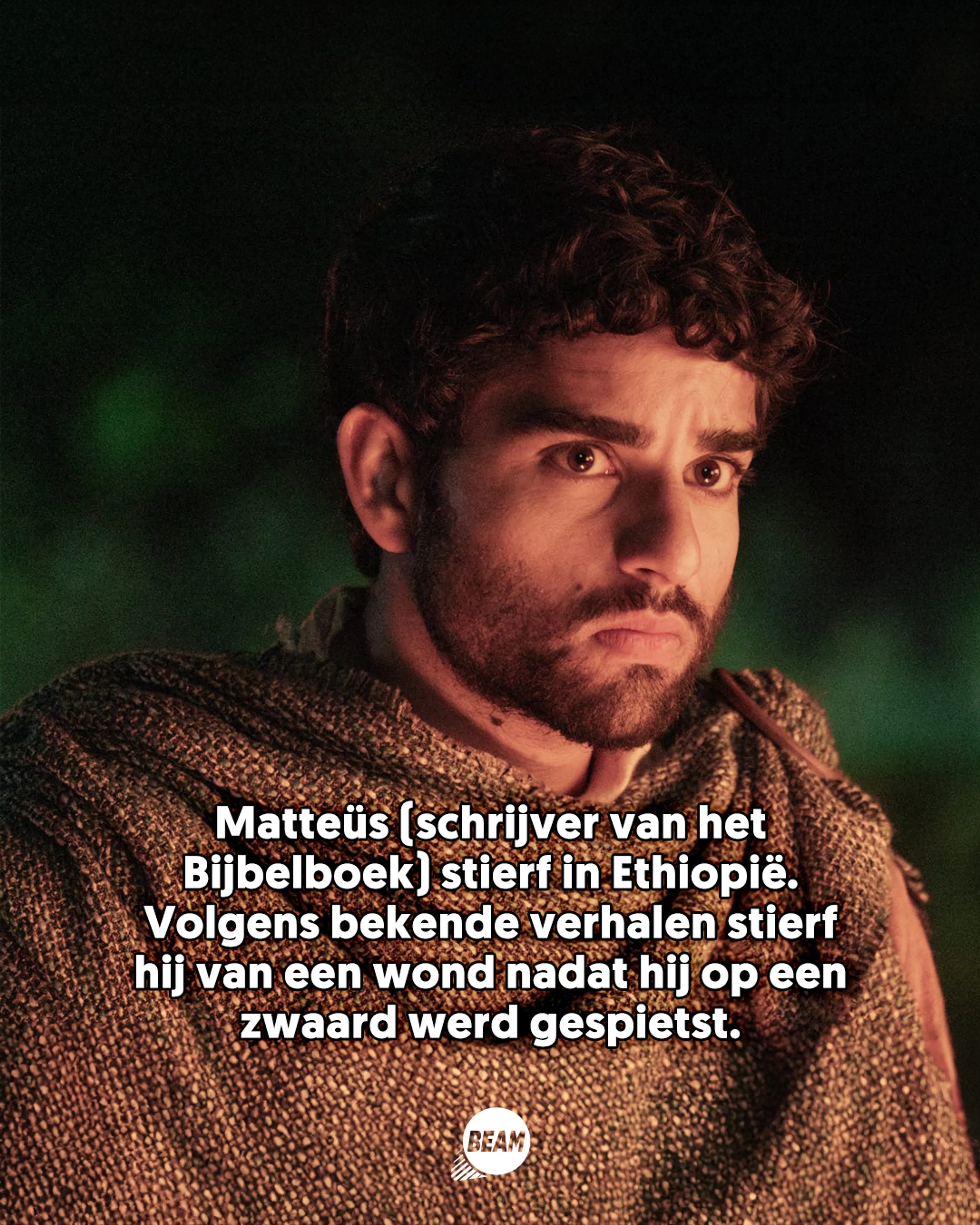 Matteüs werkte als belastingambtenaar (voor de Romeinen, de onderdrukkers van het Joodse volk) totdat Jezus vroeg of Hij hem wilde volgen. Hij gooide zijn leven om en ging met Jezus mee. Deze leerling heeft ontzettend secuur het leven van Jezus (bijvoorbeeld z’n bekendste preek, de bergrede) opgeschreven in het Bijbelboek Matteüs. Matteüs zou zijn vermoord in Ethiopië. Er zijn verschillende verhalen over hoe hij precies stierf, waaronder versies met een zwaard of een speer in de hoofdrol.