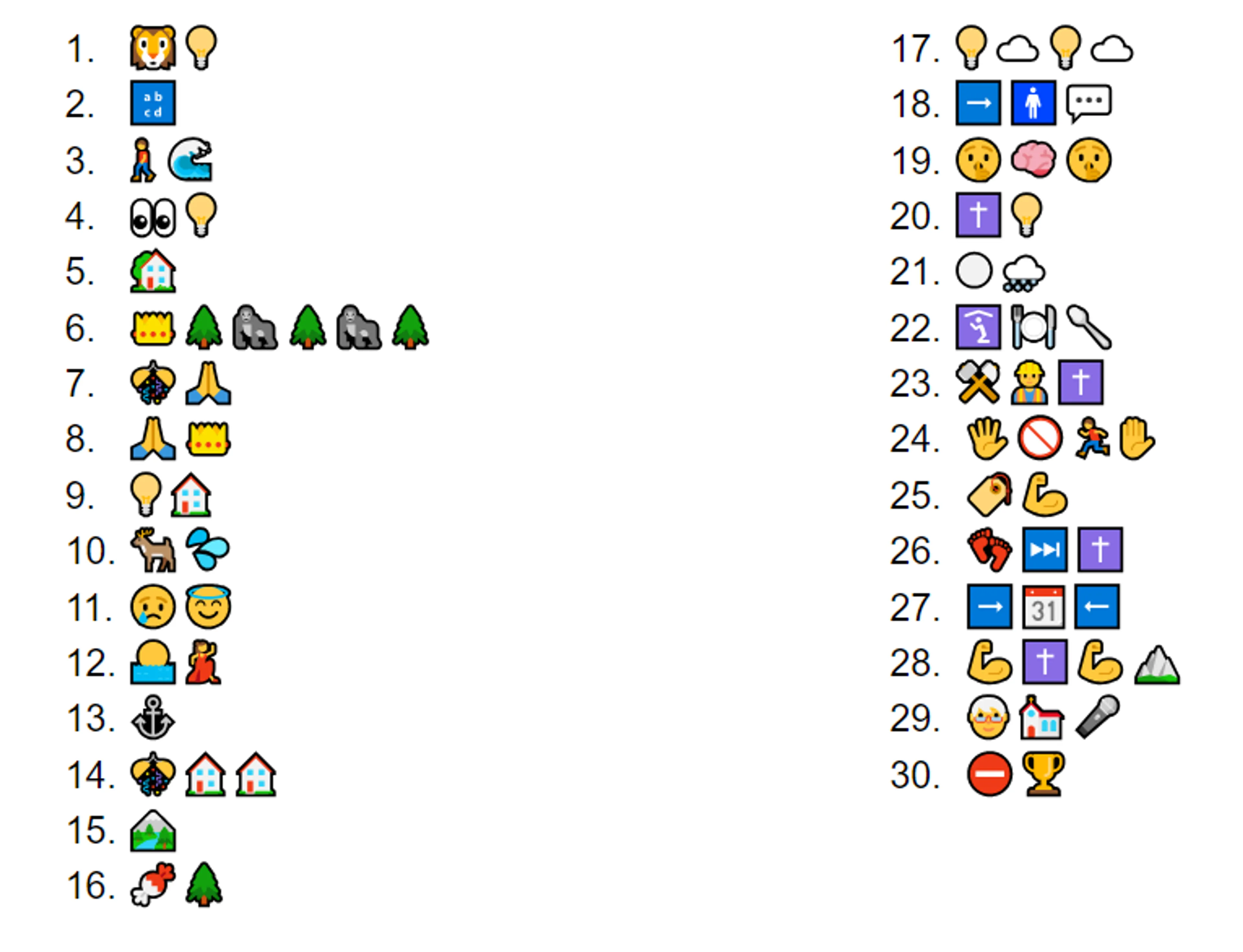 Je ziet ze de laatste tijd steeds vaker langskomen: emoji rebussen. Dit zijn raadsels in de vorm van emoticons en zorgen er voor dat je ondanks de coronacrisis toch een spelletje kan doen met vrienden of familie. Of het nou gaat over bekende films, muziek uit de jaren 80 of populaire YouTubers, alles wordt gebruikt voor deze grappige online spelletjes. Hieronder vind je 30 christelijke liedjes verpakt als emoji. Weet jij ze allemaal te vinden? Succes!