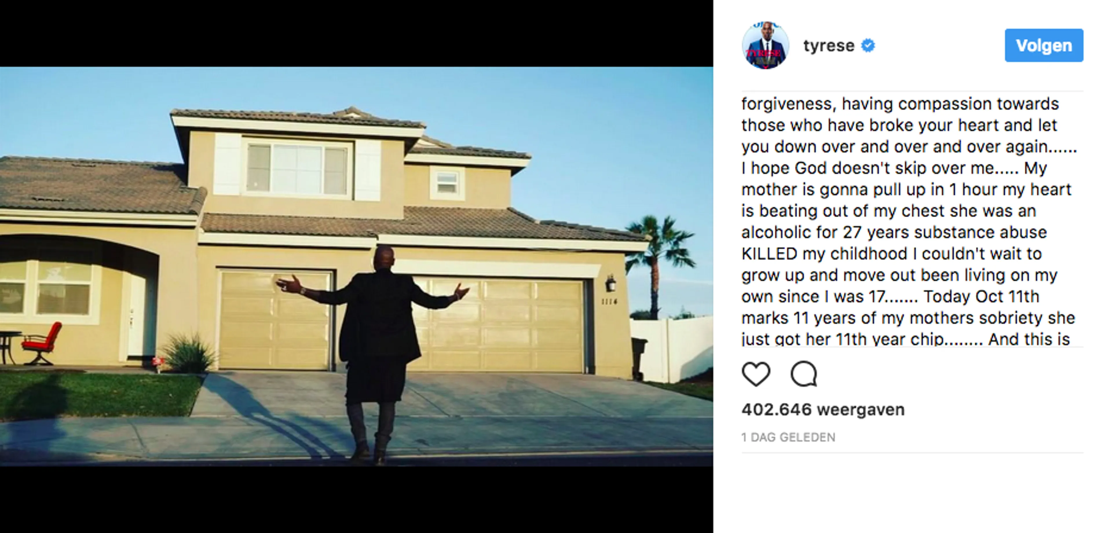 Rapper, acteur en model Tyrese heeft het niet altijd makkelijk gehad. Hij groeide op met een alcoholverslaafde moeder en ging daarom op zijn zeventiende al het huis uit. Moeilijke jaren vol woede liggen achter hem. Volgens de rapper verpestte zijn moeder zijn jeugd. Inmiddels is zijn moeder elf jaar nuchter en daarmee feliciteerde hij haar op een bijzondere manier.