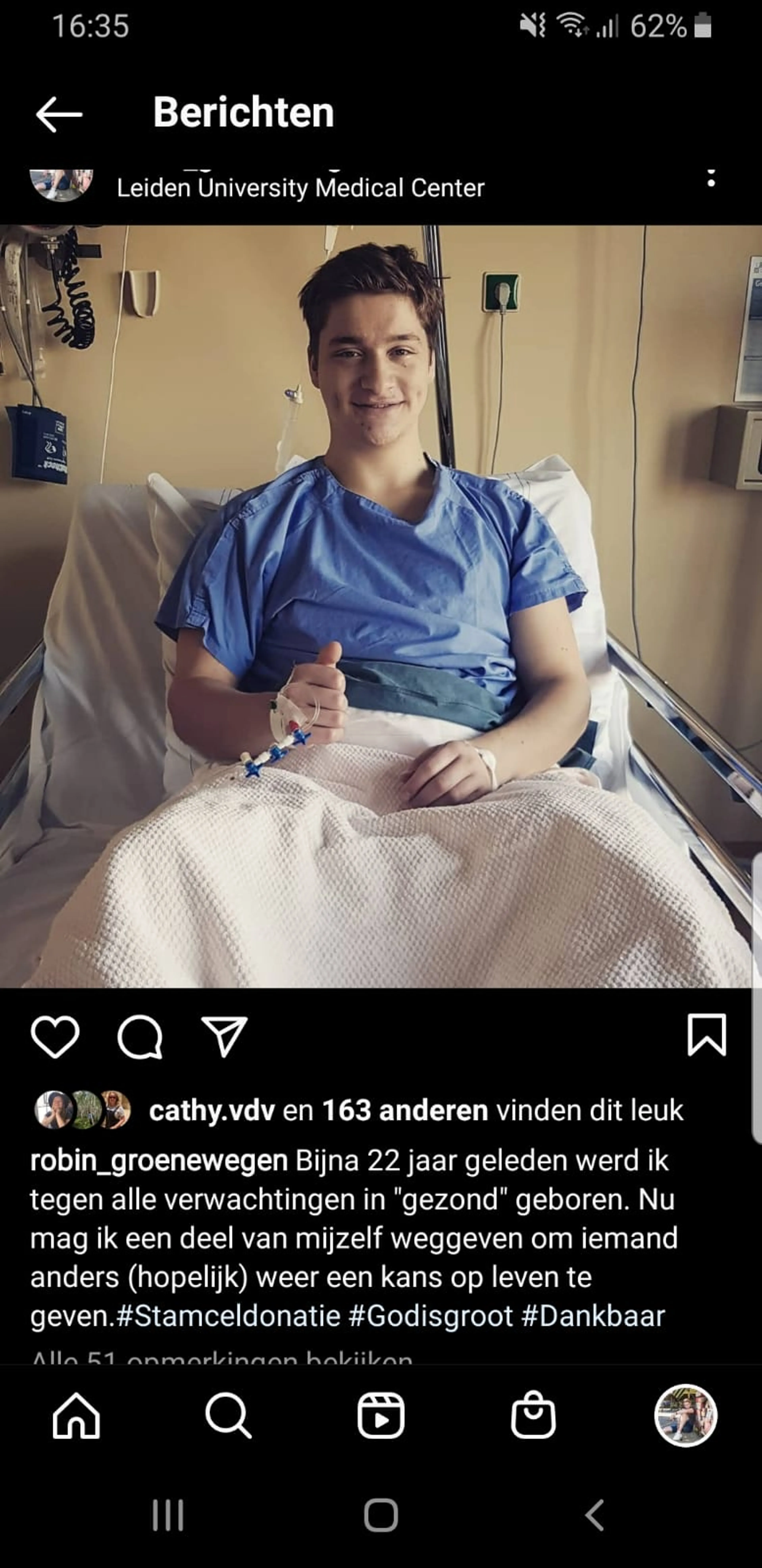 Een klein jaartje geleden krijgt Robin, net als miljoenen andere Nederlanders, een brief over de nieuwe donorwet op de mat. Terwijl hij vinkjes zet voor de organen die hij af wil staan als hij overlijdt, valt zijn oog op stamceldonatie. “Ik besloot toen eigenlijk spontaan om me ook op te geven voor stamceldonatie. Natuurlijk heb ik er eerst wat dingen over opgezocht, en erover gepraat met mijn moeder en zus. Ik dacht vooral: ‘de kans is toch heel klein dat ik word opgeroepen, dus waarom niet?’ Een paar maanden later kreeg ik een telefoontje van Stichting Matchis. Ik nam op en dacht: ‘Oh shit, daar gaan we’.”