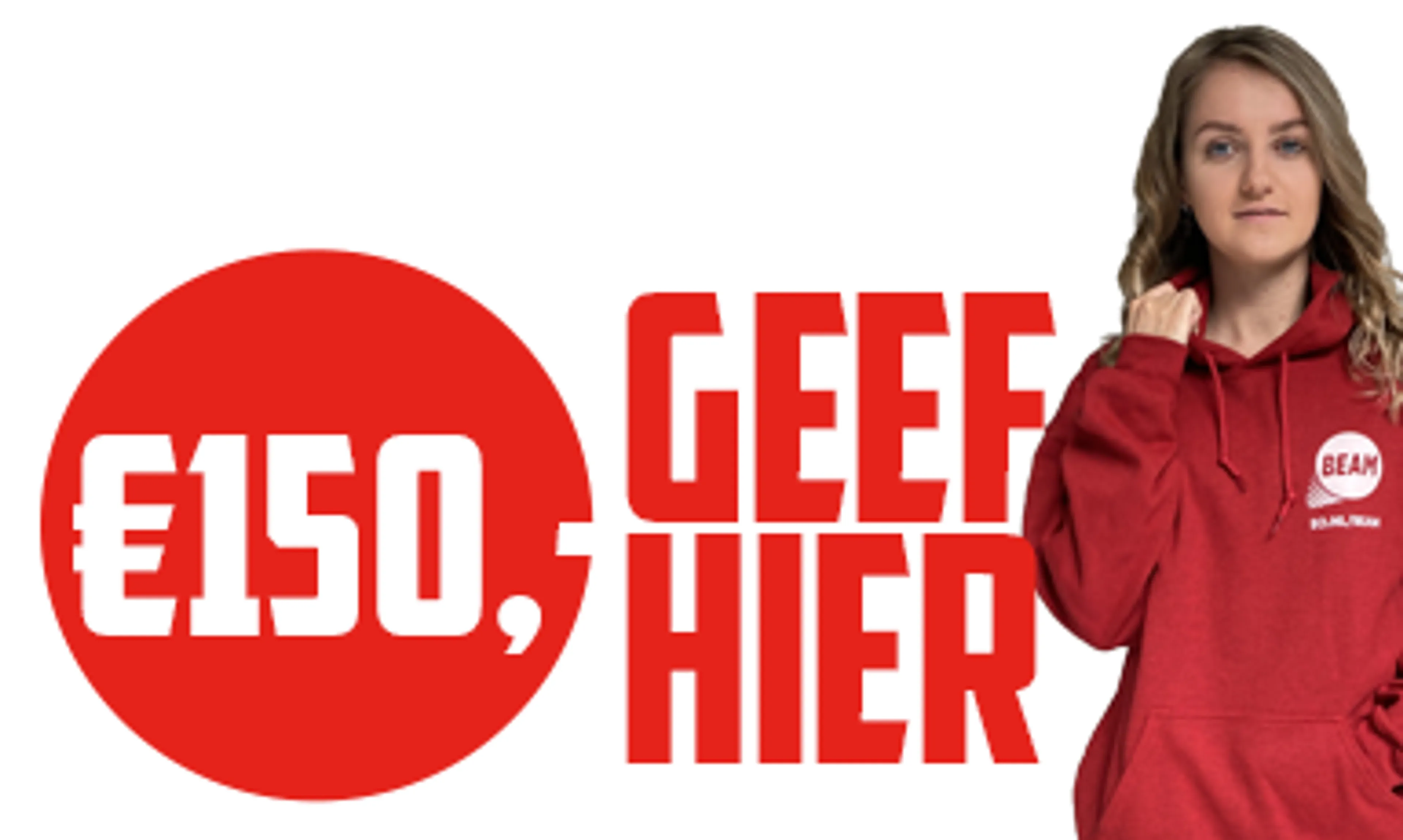 BEAM komt in de week van 20 – 24 april samen met het Leger des Heils (en jou!) in actie voor mensen die werken in de prostitutie en door de maatregelen rondom het coronavirus geen onderdak en voedsel meer hebben. Met 150 euro kunnen we één persoon voorzien van deze eerste levensbehoeften. Verzamel jij 150 euro en maak je dit in één keer naar ons over? Dan krijg jij van ons de nieuwe rode BEAM-trui cadeau zodat je kan shinen en deze 'Code Rood' actieweek zal blijven herinneren.