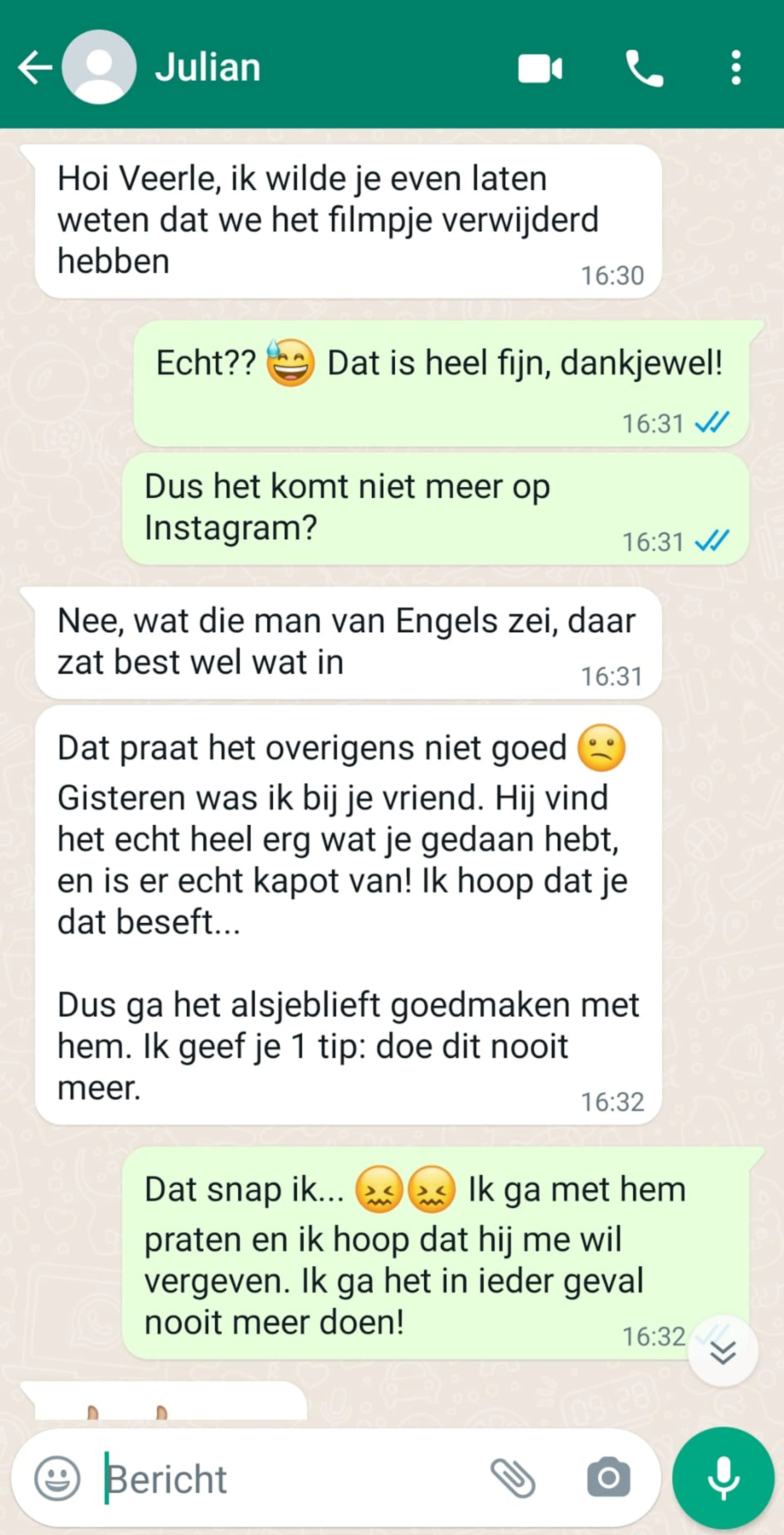 Bijna niemand van Veerles klasgenoten wil door BEAM geïnterviewd worden. Behalve Julian (18), de oudste van de klas en een van de beste vrienden van Veerles vriend. Julian: “Ik heb dat filmpje zelf niet gemaakt, maar toen ik het zag was ik zo kwaad! Matthijs is echt een goede vriend van me en hij verdient het niet dat zijn vriendin vreemdgaat. Ik wilde het Veerle betaald zetten.” Toch deed Julian dit niet en dat had een reden. “Aan het eind van de les zei meneer de Koning iets over de week tegen pesten. Hij had het erover dat pesten het leven van mensen kapot kan maken. Hij sloot af met: ‘before you judge me, make sure you are perfect’. Hier schrok ik eerlijk gezegd een beetje van, want het leek net alsof die zin voor mij bedoeld was. Ik zei tegen de jongens dat we die video van Veerle niet online moesten zetten. Eerst vonden ze van wel, maar één voor één veranderden ze van mening. Niet veel later waren ze het allemaal met me eens. Uiteindelijk hebben we het filmpje verwijderd. Wel heb ik Veerle nog even een appje gestuurd.”