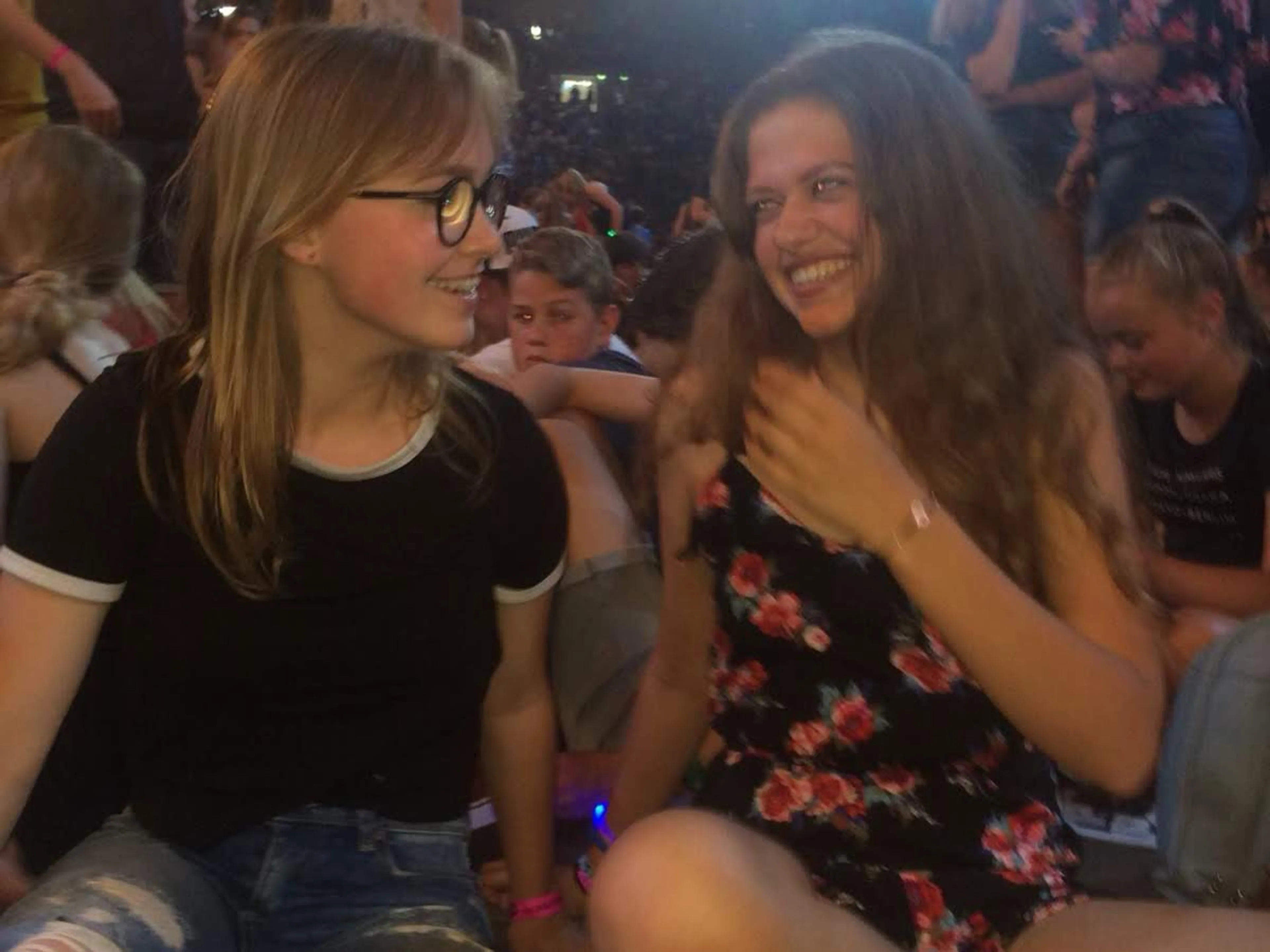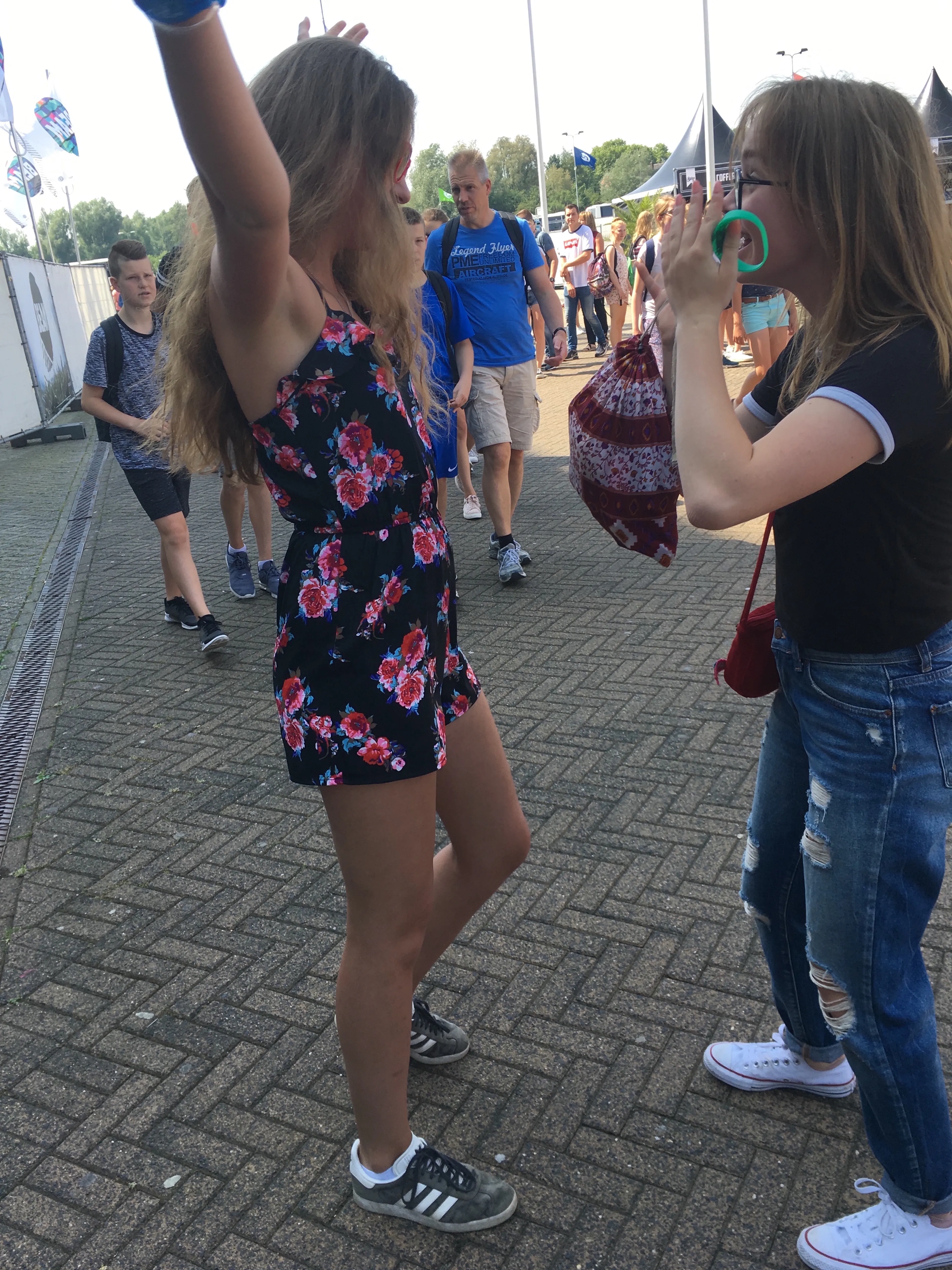 Mirte: “Ineens zag ik Bente langslopen. Ik rende uit de rij en knuffelde haar van achter. Ze had geen idee dat ik het was. Bente draaide zich om en was helemaal enthousiast. Bente: “Natuurlijk schrok ik een beetje. Ik dacht wel dat het Mirte was. Ik was zo blij en maakte allemaal blijheidsgeluiden en kon niet stoppen met lachen.” Mirte: ”Na de eerste knuffel haalde ze twee vriendschapsarmbandjes tevoorschijn. Ik weet dat ze ver weg is, maar hierdoor blijf ik aan haar denken en geeft het een beetje het gevoel alsof ze bij me is.” Bente: “Ik vond het een beetje ongemakkelijk en wist niet zo goed wat ik moest zeggen. Mirte begon over haar zonnebril die ze had gekregen. We waren in ieder geval heel blij elkaar eindelijk te zien!”