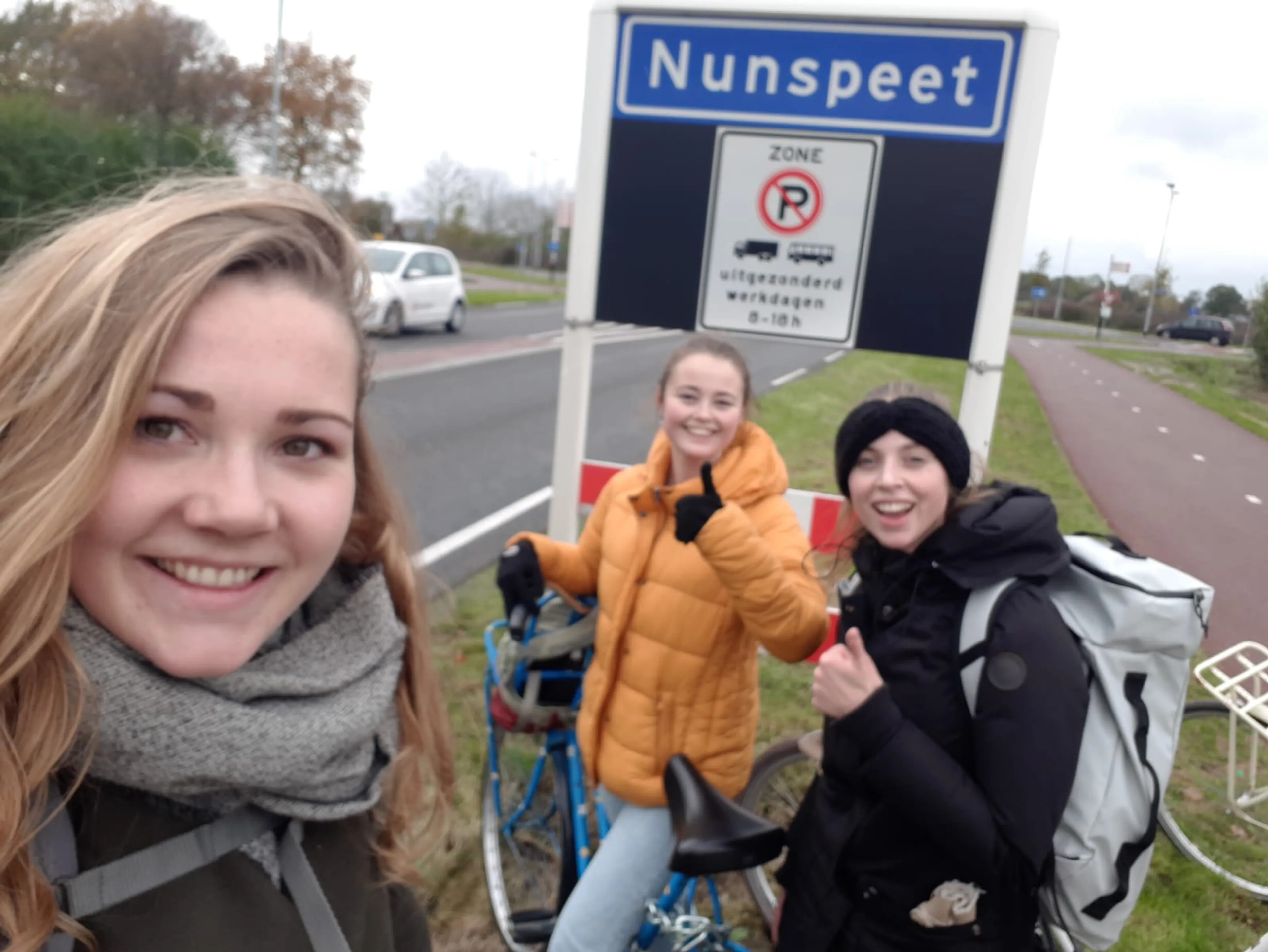 “Op zaterdagochtend vertrokken we. Per fiets! We dachten dat de trein niet energieneutraal was, dus waagden we ons aan de 2,5 uur durende tocht. Bij aankomst waren we hier zo moe van, dat we toch nog eens googelden hoe slecht de trein écht was. Wat blijkt? In Nederland rijdt de trein wél energieneutraal! Wij zijn in de war geraakt toen we lazen dat het energiegebruik op de treinstations niet altijd neutraal is.”