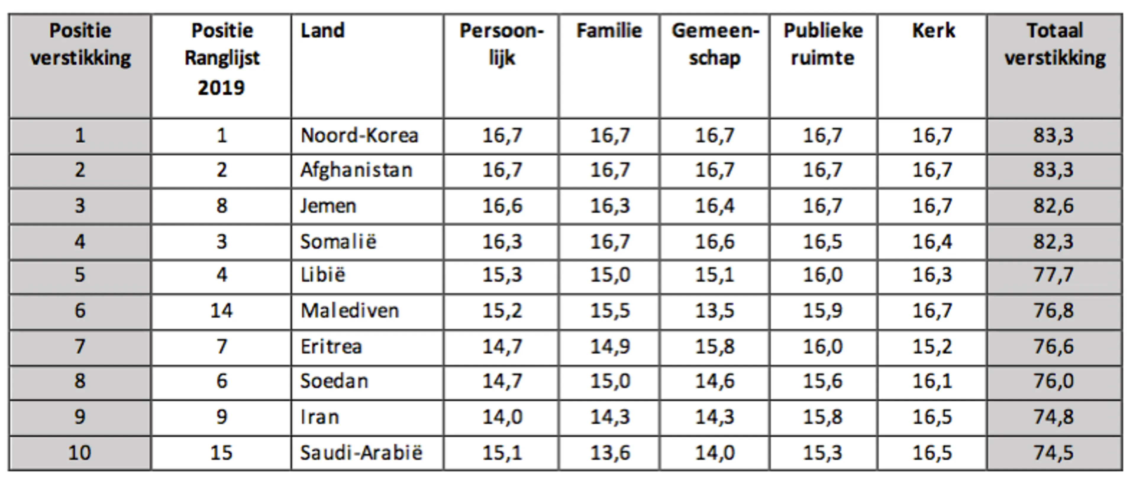 Het onderzoek wordt uitgevoerd door experts uit verschillende landen. Zij vullen vragenlijsten in over bijvoorbeeld de kerken in het land, geweld tegen christenen en leefomstandigheden van christenen. Met ieder onderwerp kunnen er punten gescoord worden en op basis van die puntentelling wordt er een ranglijst gemaakt. Het hoogst haalbare is 100 punten. Er zijn dus heel veel verschillende aspecten die bepalen hoe ernstig de christenvervolging is in een bepaald land. Van de top 10 landen met de meeste vervolgde christenen, zie je hieronder een lijst met verschillende punten. Hoe meer punten, hoe zwaarder christenen vervolgd worden.